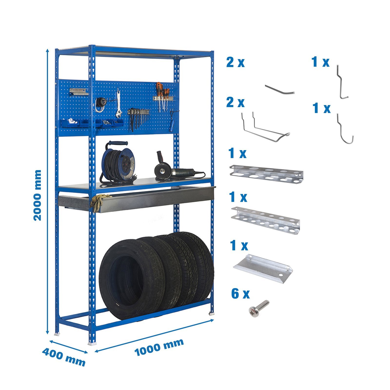 Estanteria metalica sin tornillos mas 9 accesorios de color azul/galva. Con cajon. Tiene una capacidad de carga por estante de 200 kg. Con unas medidas en mm de 2000x1000x400. Fabricada en Europa por Simonrack y se monta rapido siguiendo las instrucciones