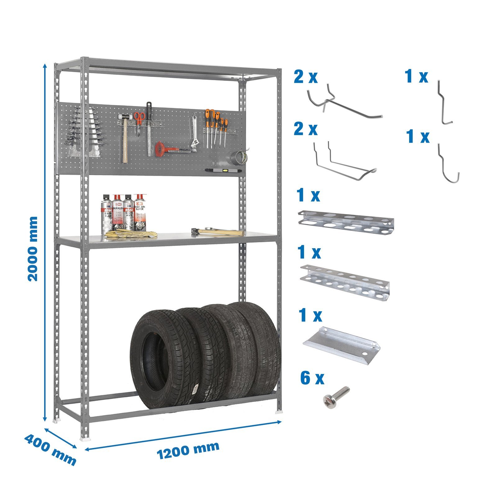 Estanteria metalica sin tornillos mas 9 accesorios de color gris. Tiene una capacidad de carga por estante de 180 kg. Con unas medidas en mm de 2000x1200x400. Fabricada en Europa por Simonrack y se monta rapido siguiendo las instrucciones