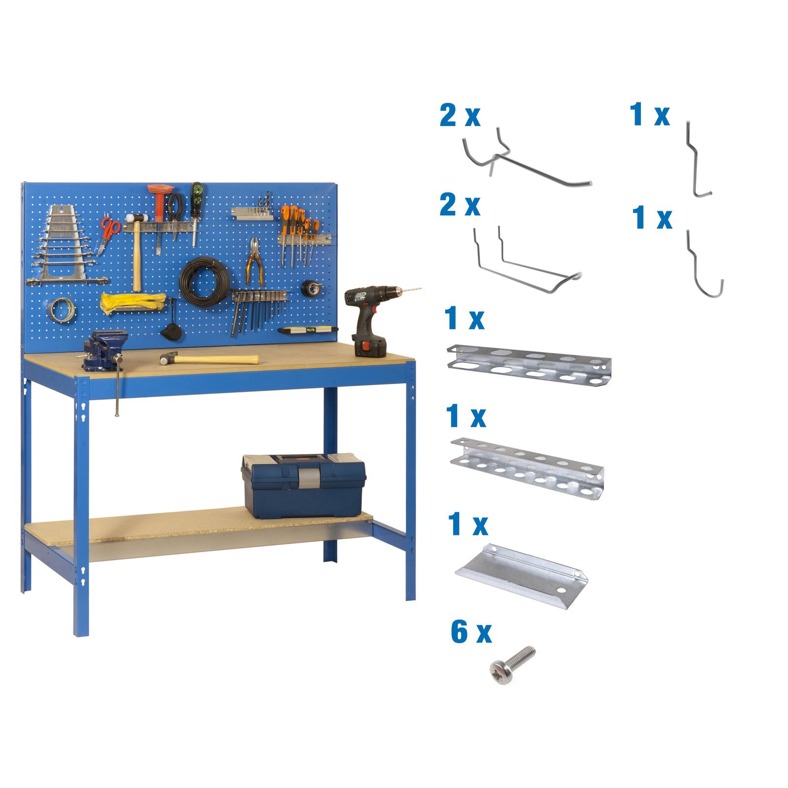 Banco de trabajo sin tornillos mas 9 accesorios de color azul/madera. Tiene 2 estantes. Incluye aglomerado. Tiene una capacidad de carga por estante de 600 kg. Con unas medidas en mm de 1445x910x610. Fabricada en Europa por Simonrack y se monta rapido siguiendo las instrucciones