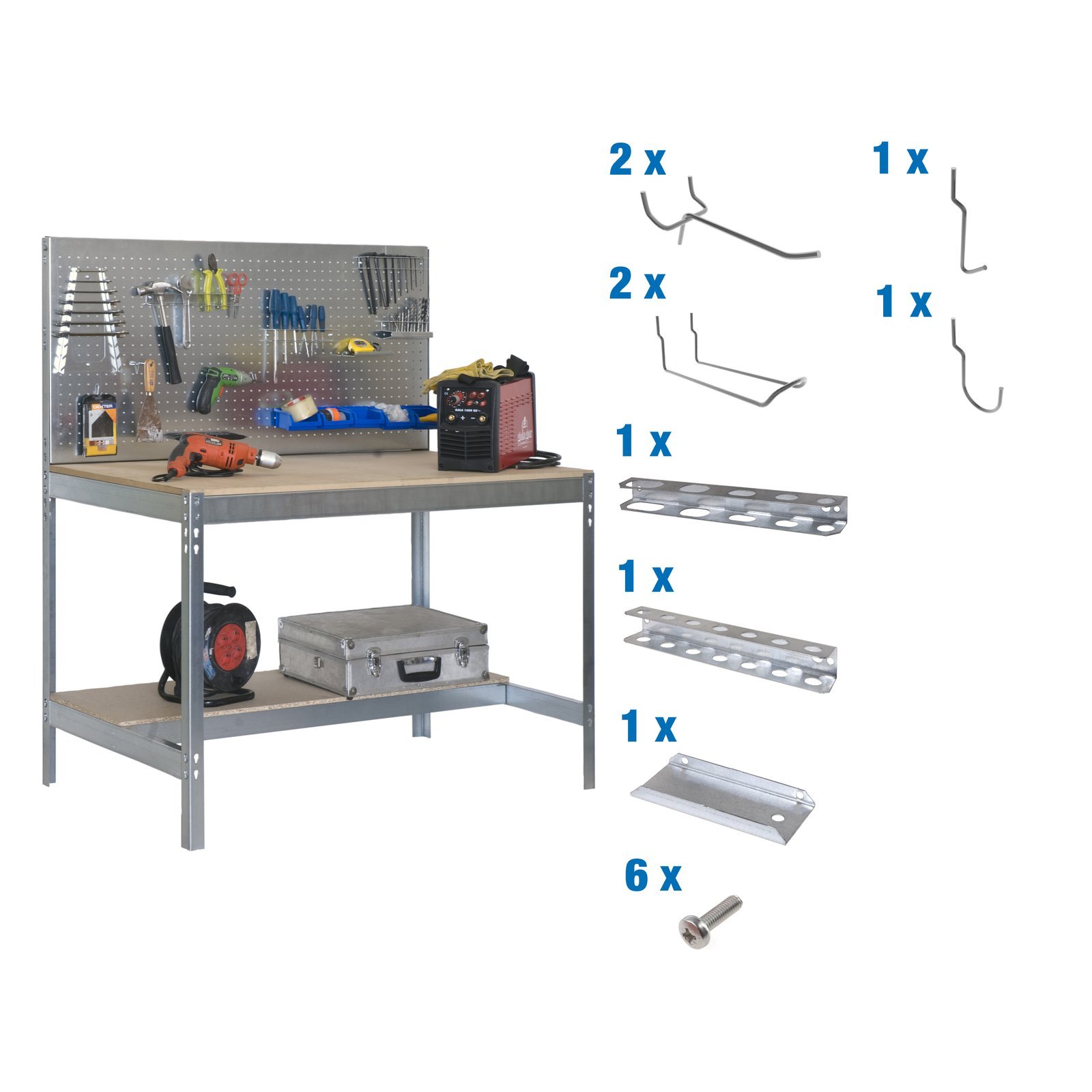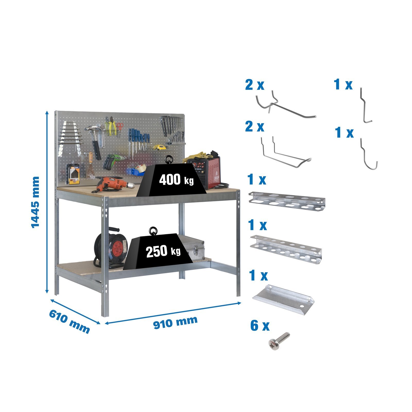 Banco de trabajo sin tornillos mas 9 accesorios de color galva/madera. Tiene 2 estantes. Incluye aglomerado. Tiene una capacidad de carga por estante de 600 kg. Con unas medidas en mm de 1445x910x610. Fabricada en Europa por Simonrack y se monta rapido siguiendo las instrucciones