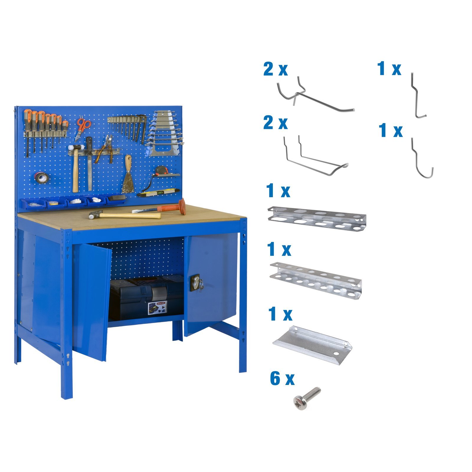 Banco de trabajo sin tornillos mas 9 accesorios de color azul/madera. Con armario. Tiene 2 estantes. Incluye aglomerado. Tiene una capacidad de carga por estante de 600 kg. Con unas medidas en mm de 1445x1210x610. Fabricada en Europa por Simonrack y se monta rapido siguiendo las instrucciones