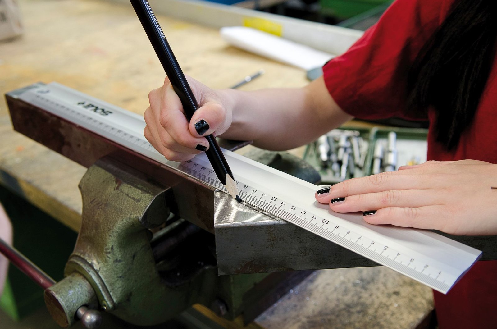 Marcada en una cara en mm. Anchura 50mm. Grosor 5mm. Funda de plástico.