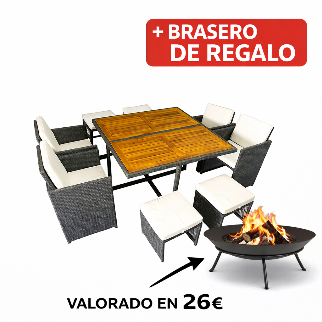 Set Cubo Java Ratán Sintético 9 Pzas 53x53x69 40x40x35 Cm Mueble Fibra + Brasero Exterior De Regalo