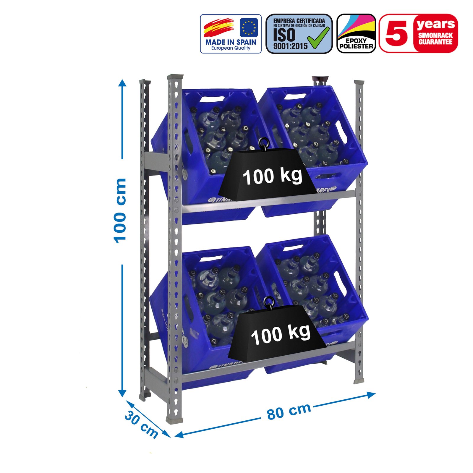 Botellero metalico de color GRIS y medidas (alto x ancho x largo) KIT SIMONBOTTLE 2-1000x800x300 GRIS mm. Tiene 1000x800x300 estantes y una capacidad de carga por estante de 100 kg. Ideal para alamacenamiento de botellas o similares. Hecho en Europa, calidad europea, podras encontrar las instrucciones en el interior. Medidas en uso del producto, 991x810x310 mm