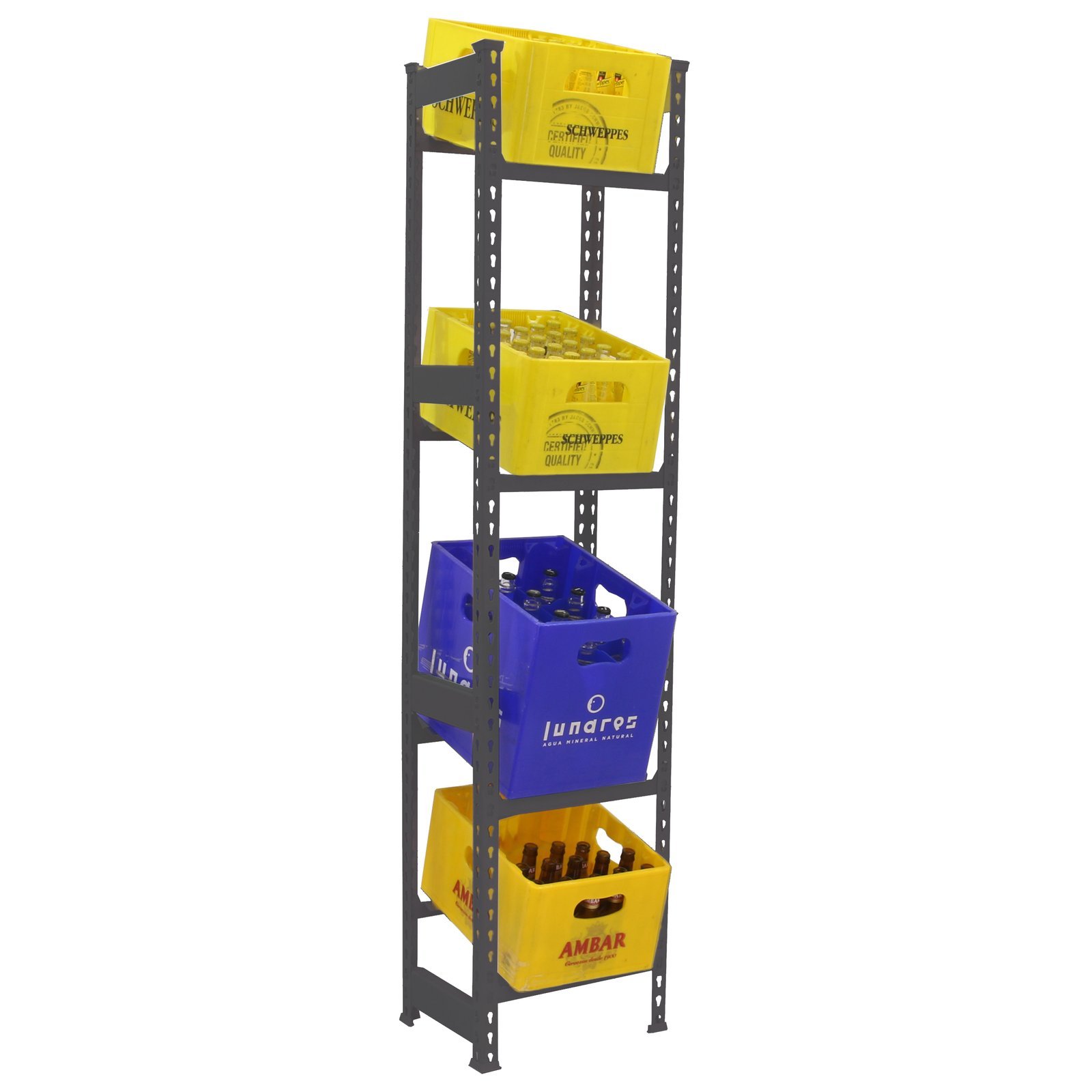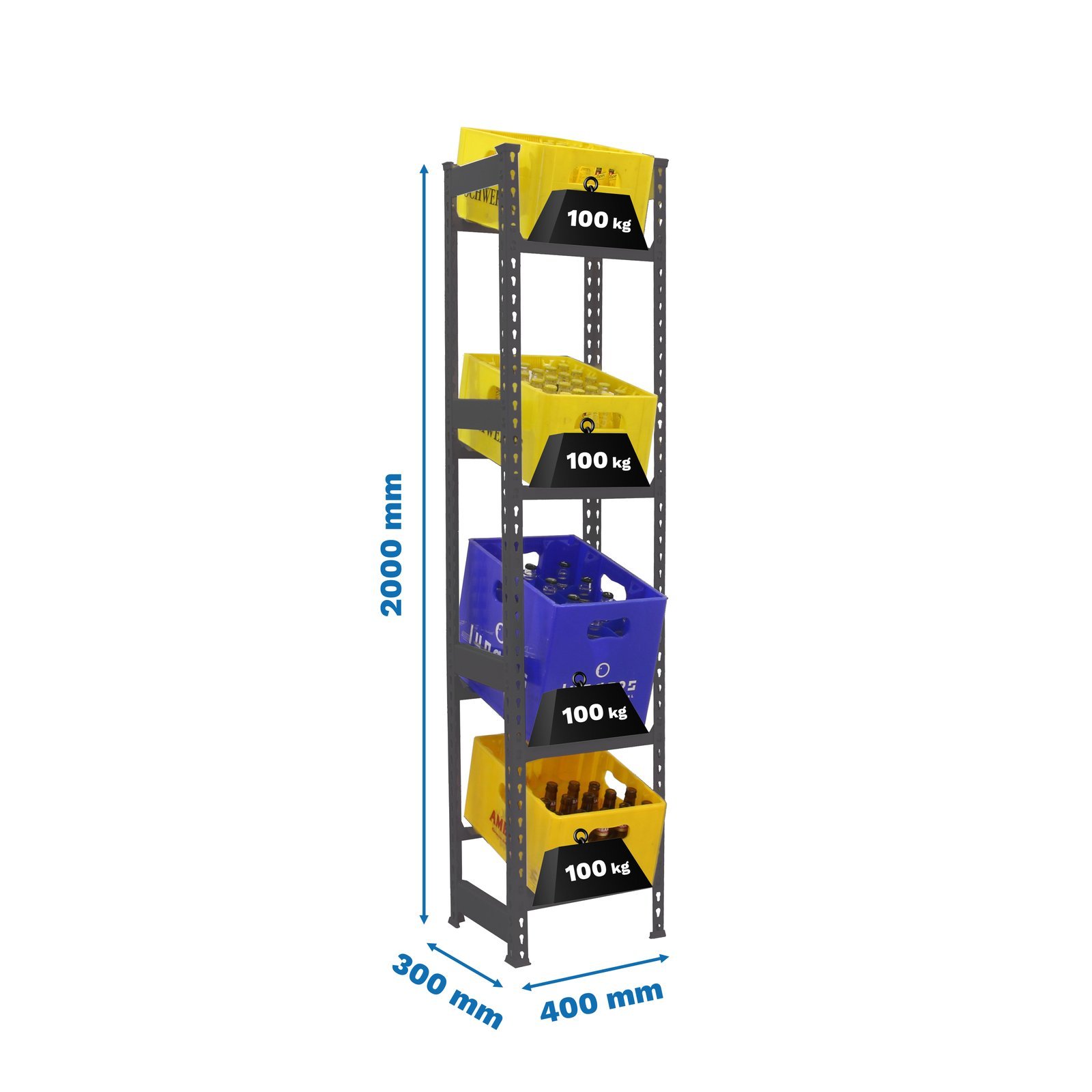 Botellero metalico ideal para hosteleria y comercio. Tiene 4 estantes para cajas de botellas. Es de color antracita. Las dimensiones del botellero (alto x ancho x fondo) son, 2000x400x300 mm. Tiene una capacidad de carga de 100 kg por estante. Contiene 8 topes de plastico. No se tambalea y no tiene aristas de corte. Producto fabricado en Europa por Simonrack