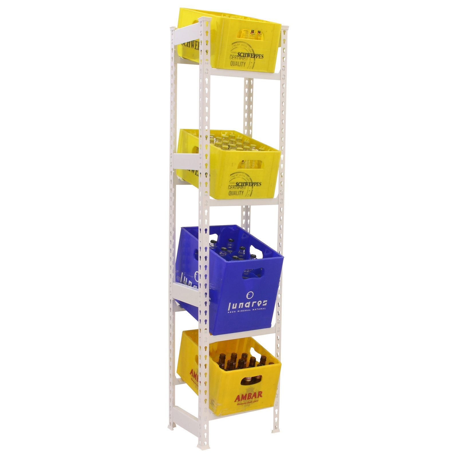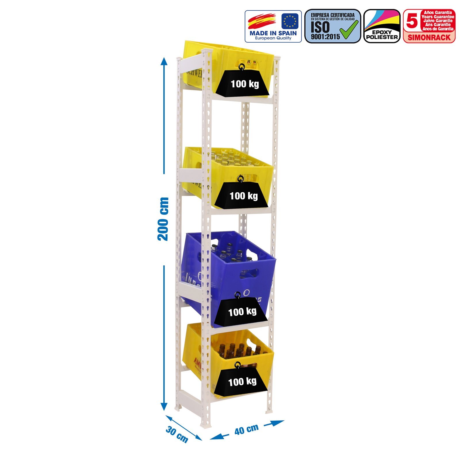 Botellero metalico de color BLANCO y medidas (alto x ancho x largo) KIT SIMONBOTTLE 4-2000x400x300 BLANCO mm. Tiene 2000x400x300 estantes y una capacidad de carga por estante de 100 kg. Ideal para alamacenamiento de botellas o similares. Hecho en Europa, calidad europea, podras encontrar las instrucciones en el interior. Medidas en uso del producto, 1975x410x310 mm