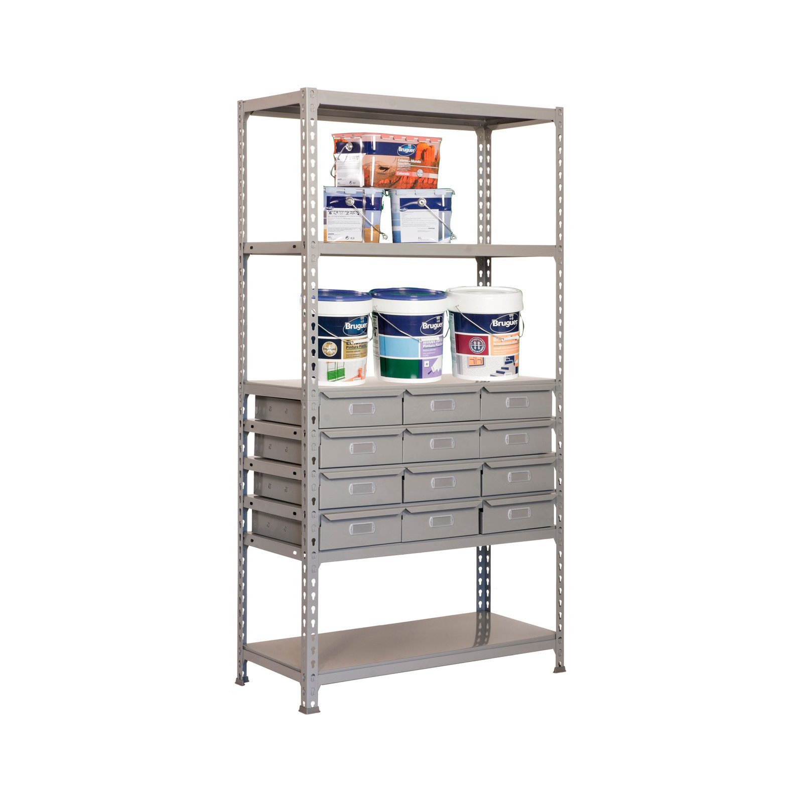 Estanteria metalica con cajones. Tiene 5 estantes. Estanteria que se monta de forma facil y comoda gracias a su sistema de click, sin tornillos simplemente con la ayuda de un martillo podras tener esta estanteria montada en unos minutos. Tiene una capacidad de carga de 200 kgs. No se tambalea y no tiene aristas de corte, manipulacion sin riesgo. Es un producto fabricado en Europa por Simonrack. Medidas en uso del producto, 1787x910x410 mm