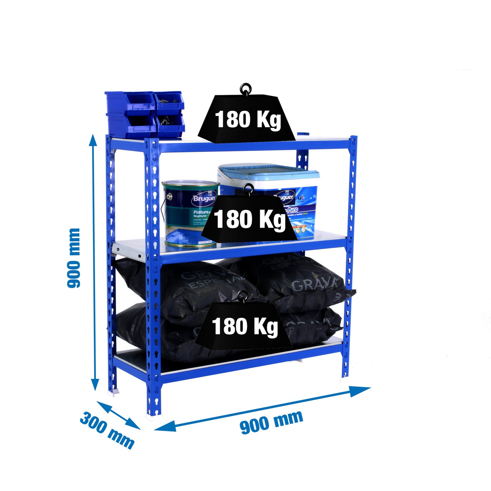 Estanteria metalica sin tornillos de color AZUL/GALVA con capacidad de carga por estante de 180 kg. El numero de estantes es 3 y las medidas (alto x ancho x fondo) son 900x900x300 mm. La unica estanteria que permite poner las bandejas en tres posiciones diferentes. Producto europeo, calidad europea, podras encontrar las instrucciones de montaje en su interior o en este enlace, https, //www. youtube. com/watch?v=u3t2f21Mm7I. Medidas en uso del producto, 877x910x310 mm