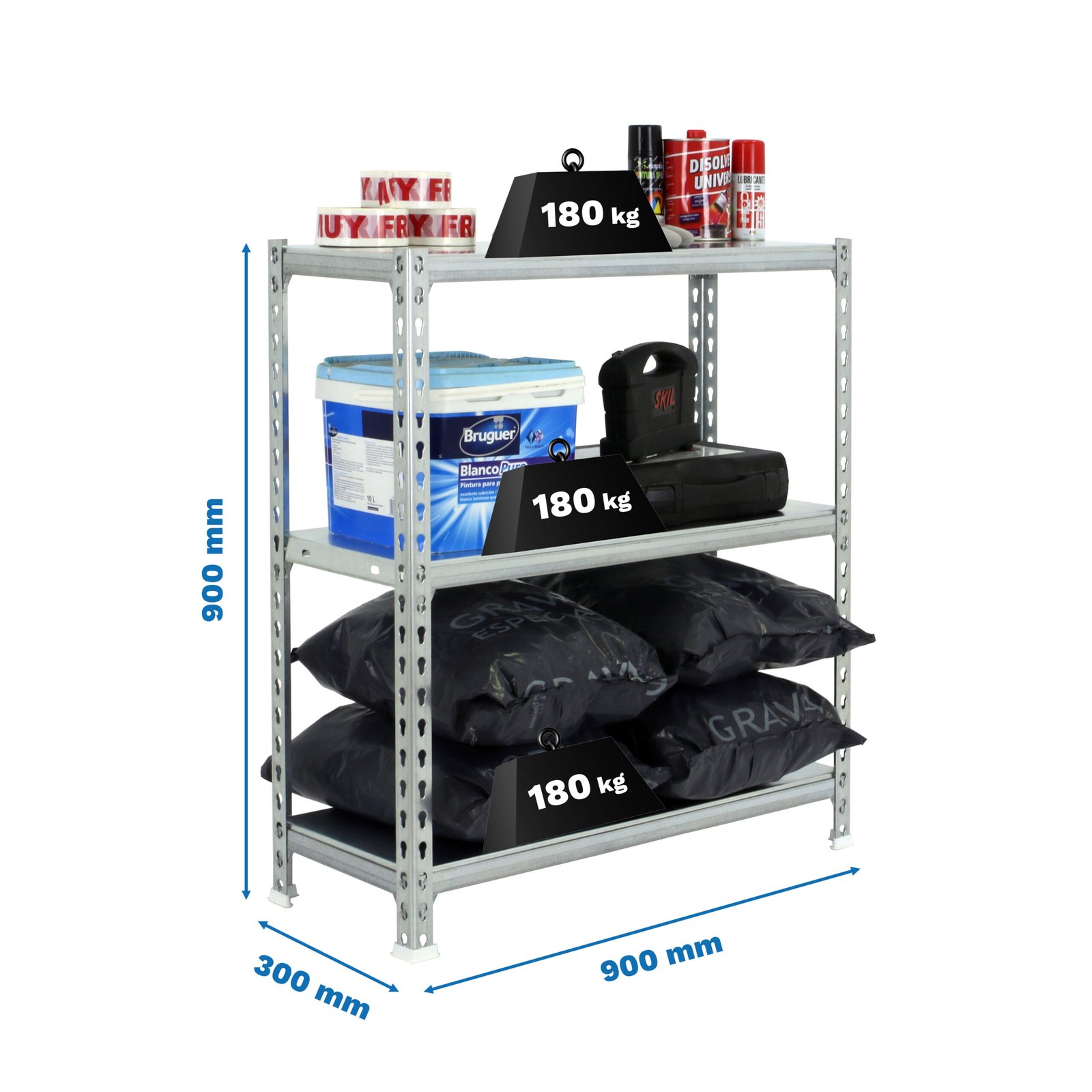 Estanteria metalica sin tornillos de color GALVA/GALVA con capacidad de carga por estante de 180 kg. El numero de estantes es 3 y las medidas (alto x ancho x fondo) son 900x900x300 mm. La unica estanteria que permite poner las bandejas en tres posiciones diferentes. Producto europeo, calidad europea, podras encontrar las instrucciones de montaje en su interior o en este enlace, https, //www. youtube. com/watch?v=u3t2f21Mm7I. Medidas en uso del producto, 877x910x310 mm