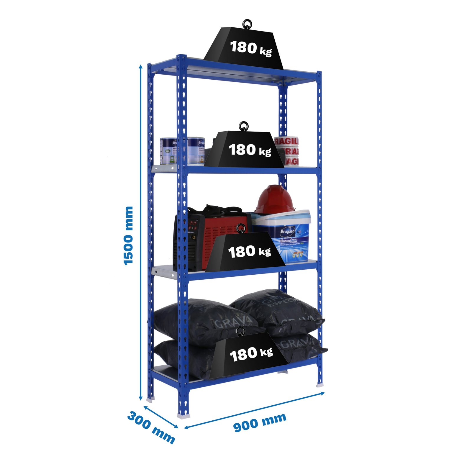 Estanteria metalica sin tornillos de color AZUL/GALVA con capacidad de carga por estante de 180 kg. El numero de estantes es 4 y las medidas (alto x ancho x fondo) son 1500x900x300 mm. La unica estanteria que permite poner las bandejas en tres posiciones diferentes. Producto europeo, calidad europea, podras encontrar las instrucciones de montaje en su interior o en este enlace, https, //www. youtube. com/watch?v=u3t2f21Mm7I. Medidas en uso del producto, 1485x910x310 mm