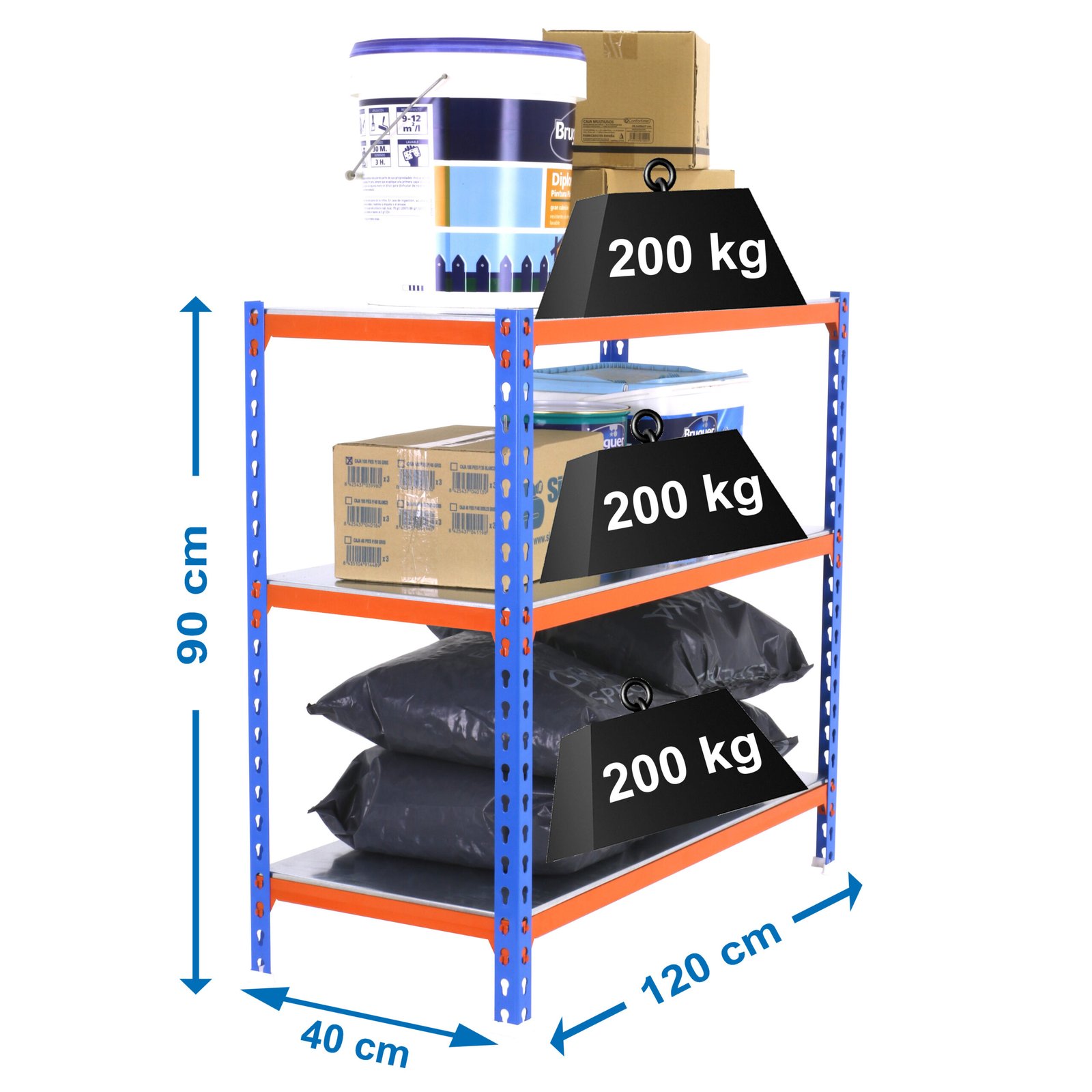 Estanteria metalica sin tornillos, de color azul/naranja/galva con 3 estantes. Tiene una capacidad de carga por estante de 200 kg y una capacidad total de 600 kgs. Con unas medidas en mm de 900x1200x400. Es el unico sistema de ordenacion del mundo que puede colocar las bandejas en 3 posiciones diferentes, recta o estandar, inclinada y contenedora. Fabricada en Europa por Simonrack y se monta rapido siguiendo las instrucciones