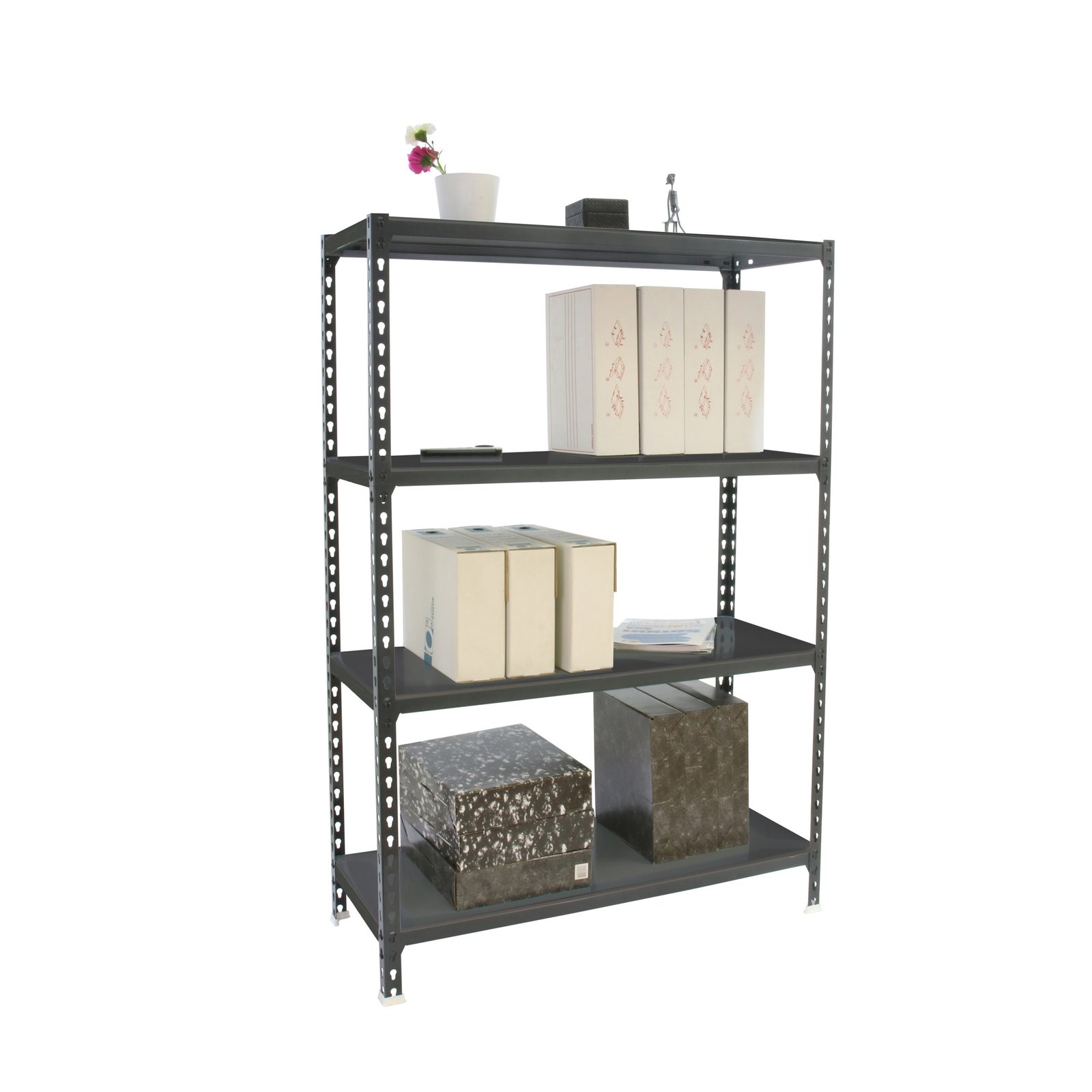 Estanteria metalica sin tornillos con bandeja metalica, de color ANTRACITA/ANTRACITA. Tiene 4 estantes. Las dimensiones de esta estanteria son, 1500x1200x500 mm. Y tiene una capacidad de carga de 200 kgs por estante. Es el unico sistema de ordenacion del mundo que puede colocar las bandejas en 3 posiciones diferentes, recta o estandar, inclinada y contenedora. Es fabricado en Europa por Simonrack y se monta rapido siguiendo las instrucciones