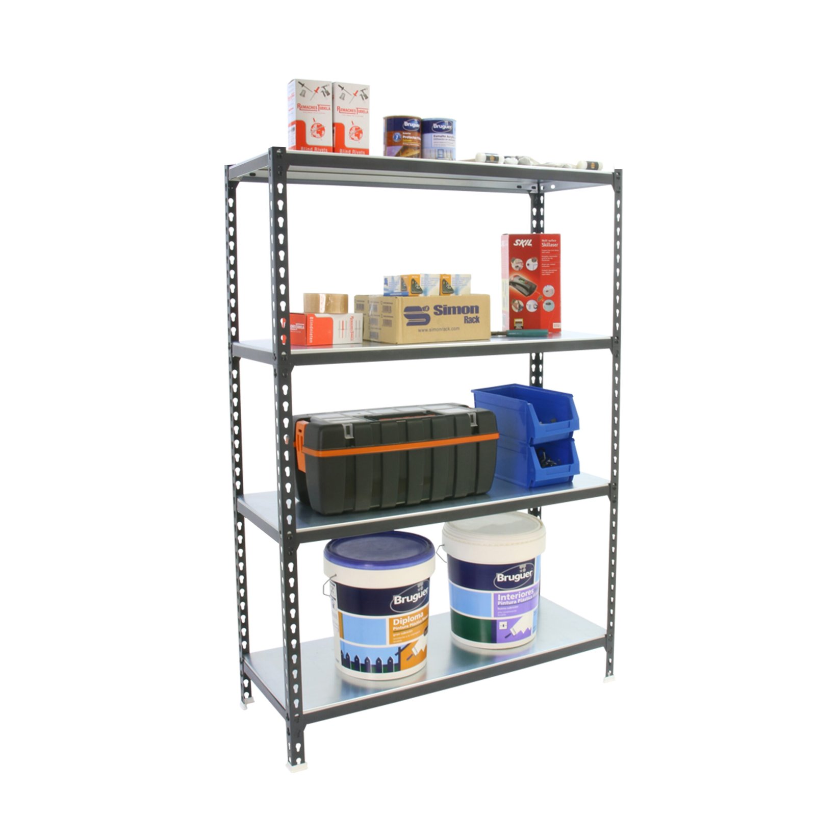 Estanteria metalica sin tornillos con bandeja metalica, de color ANTRACITA/GALVA. Tiene 4 estantes. Las dimensiones de esta estanteria son, 1500x1200x500 mm. Y tiene una capacidad de carga de 200 kgs por estante. Es el unico sistema de ordenacion del mundo que puede colocar las bandejas en 3 posiciones diferentes, recta o estandar, inclinada y contenedora. Es fabricado en Europa por Simonrack y se monta rapido siguiendo las instrucciones