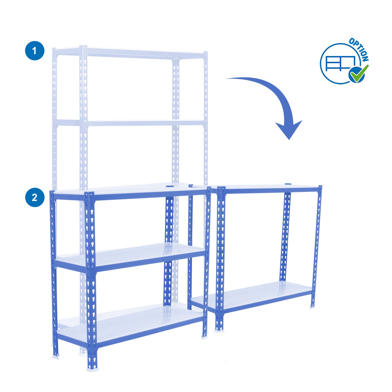 Estanteria metalica sin tornillos, de color azul/blanco con 5 estantes. Tiene una capacidad de carga por estante de 200 kg y una capacidad total de 1000 kgs. Con unas medidas en mm de 2000x1200x500. Es el unico sistema de ordenacion del mundo que puede colocar las bandejas en 3 posiciones diferentes, recta o estandar, inclinada y contenedora. Fabricada en Europa por Simonrack y se monta rapido siguiendo las instrucciones