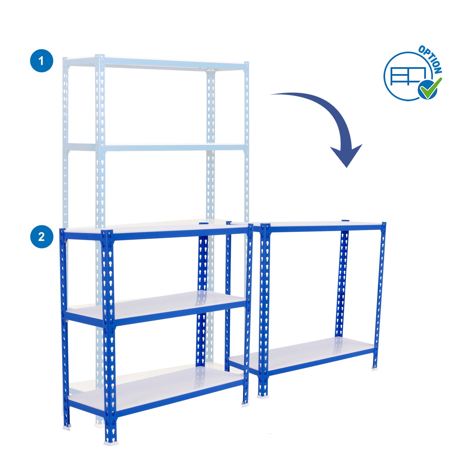 Estanteria metalica sin tornillos, de color azul/galva con 5 estantes. Tiene una capacidad de carga por estante de 200 kg y una capacidad total de 1000 kgs. Con unas medidas en mm de 2000x1200x500. Es el unico sistema de ordenacion del mundo que puede colocar las bandejas en 3 posiciones diferentes, recta o estandar, inclinada y contenedora. Fabricada en Europa por Simonrack y se monta rapido siguiendo las instrucciones