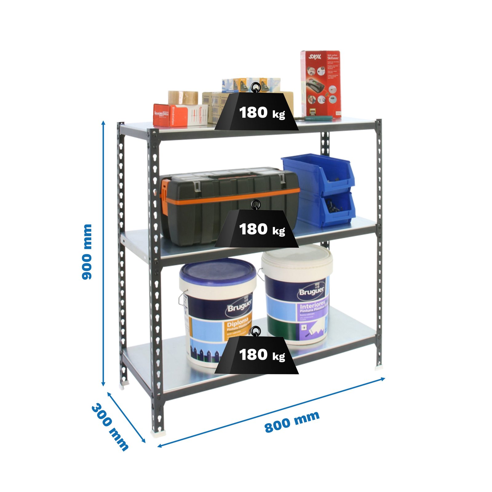 Estanteria metalica sin tornillos con bandeja metalica, de color ANTRACITA/GALVA. Tiene 3 estantes. Las dimensiones de esta estanteria son, 900x800x300 mm. Y tiene una capacidad de carga de 180 kgs por estante. Es el unico sistema de ordenacion del mundo que puede colocar las bandejas en 3 posiciones diferentes, recta o estandar, inclinada y contenedora. Es fabricado en Europa por Simonrack y se monta rapido siguiendo las instrucciones