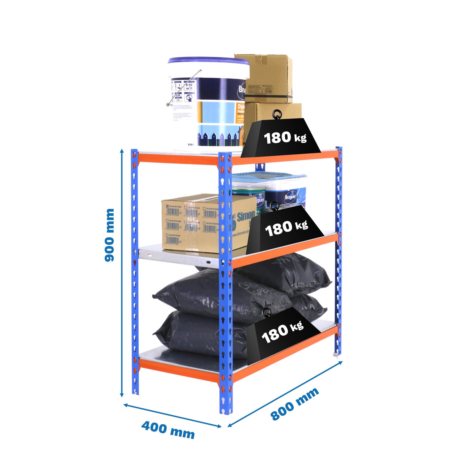 Estanteria metalica sin tornillos de color AZUL/NARANJA/GALVA con capacidad de carga por estante de 180 kg. El numero de estantes es 3 y las medidas (alto x ancho x fondo) son 900x800x400 mm. La unica estanteria que permite poner las bandejas en tres posiciones diferentes. Producto europeo, calidad europea, podras encontrar las instrucciones de montaje en su interior o en este enlace, https, //www. youtube. com/watch?v=u3t2f21Mm7I. Medidas en uso del producto, 877x810x410 mm