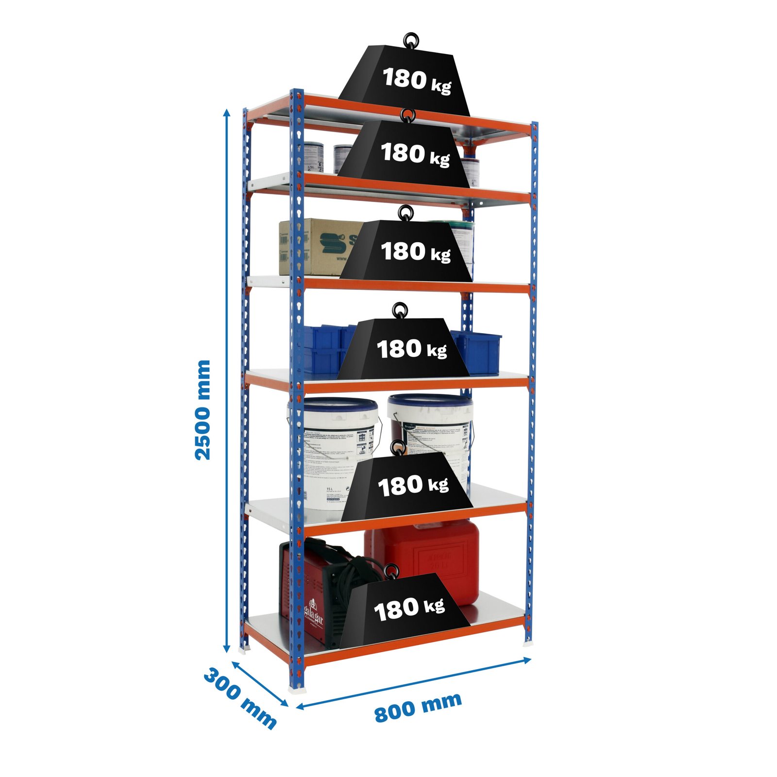 Estanteria metalica sin tornillos de color AZUL/NARANJA/GALVA con capacidad de carga por estante de 180 kg. El numero de estantes es 6 y las medidas (alto x ancho x fondo) son 2500x800x300 mm. La unica estanteria que permite poner las bandejas en tres posiciones diferentes. Producto europeo, calidad europea, podras encontrar las instrucciones de montaje en su interior o en este enlace, https, //www. youtube. com/watch?v=u3t2f21Mm7I. Medidas en uso del producto, 2510x810x310 mm