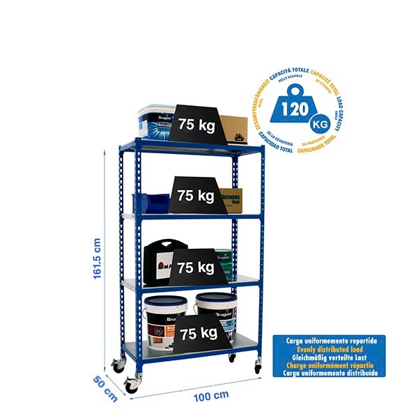 Estanteria metalica sin tornillos de color AZUL/GALVA con capacidad de carga por estante de 70 kg. El numero de estantes es 4 y las medidas (alto x ancho x fondo) son 1575x1000x500 mm. La unica estanteria que permite poner las bandejas en tres posiciones diferentes. Producto europeo, calidad europea, podras encontrar las instrucciones de montaje en su interior o en este enlace, https, //www. youtube. com/watch?v=u3t2f21Mm7I. Medidas en uso del producto, 1573x1100x510 mm
