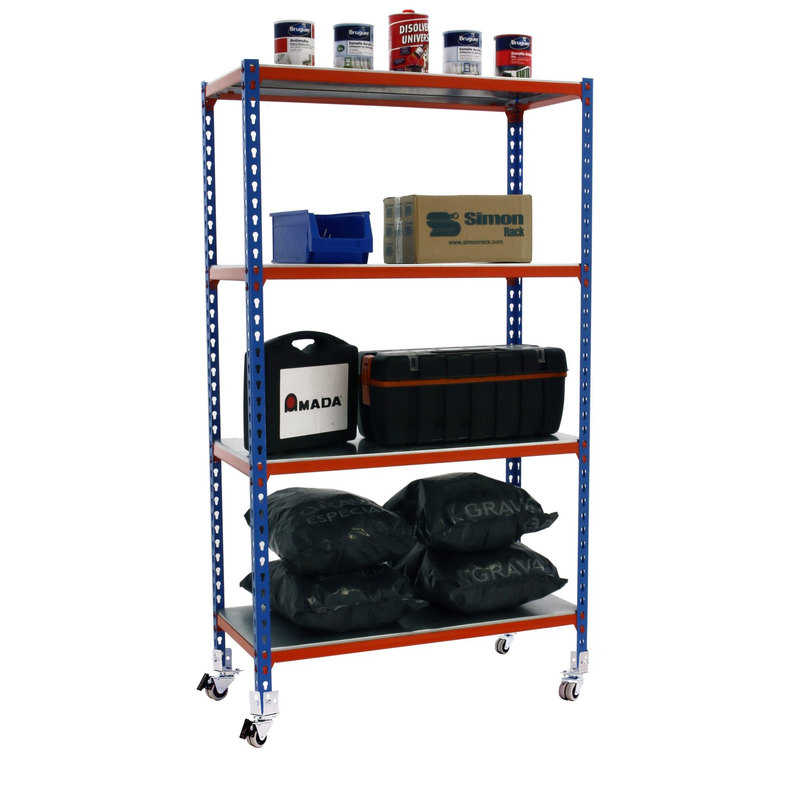 Estanteria metalica sin tornillos de color AZUL/NARANJA/GALVA con capacidad de carga por estante de 70 kg. El numero de estantes es 4 y las medidas (alto x ancho x fondo) son 1575x1100x400 mm. La unica estanteria que permite poner las bandejas en tres posiciones diferentes. Producto europeo, calidad europea, podras encontrar las instrucciones de montaje en su interior o en este enlace, https, //www. youtube. com/watch?v=u3t2f21Mm7I. Medidas en uso del producto, 1573x1110x410 mm