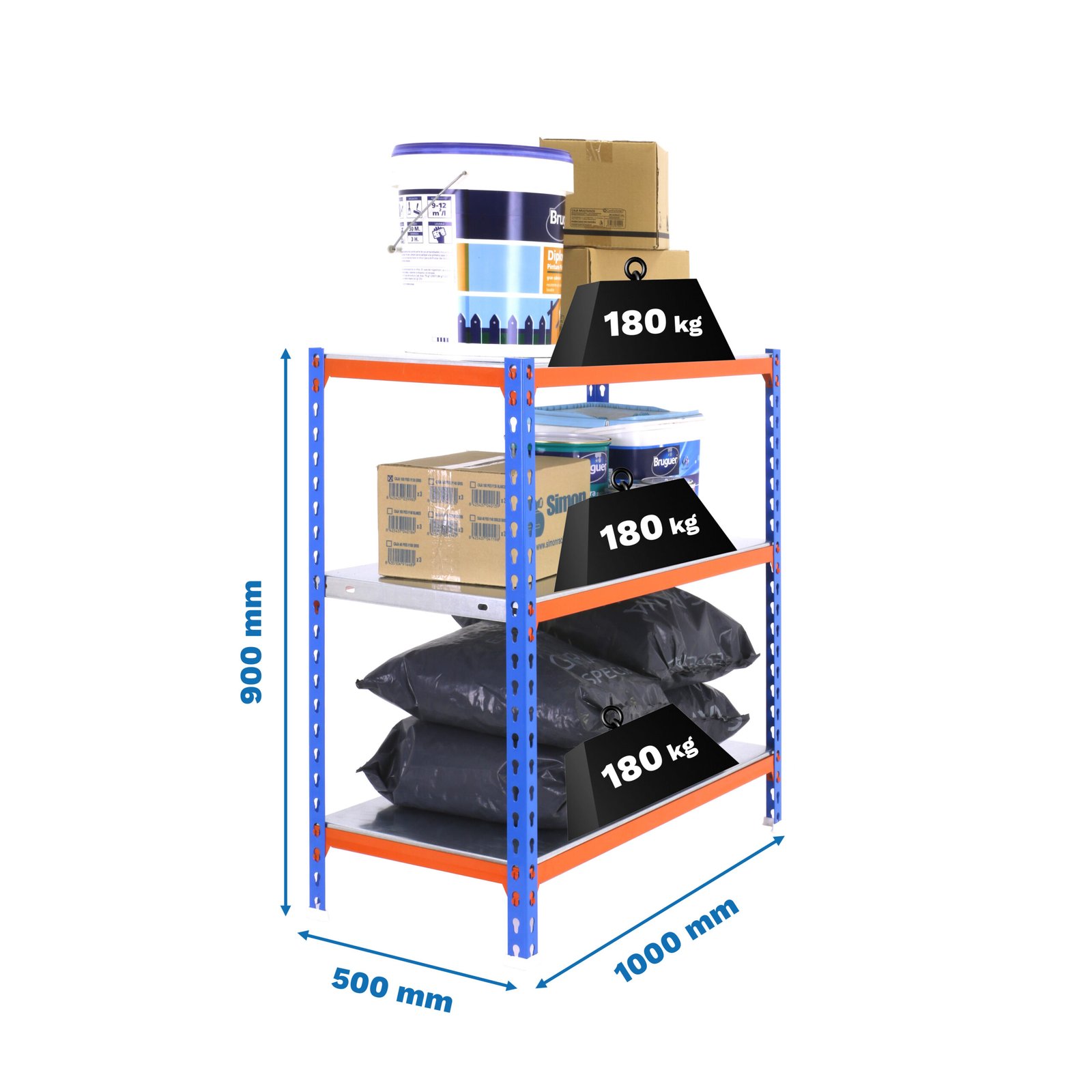 Estanteria metalica sin tornillos de color AZUL/NARANJA/GALVA con capacidad de carga por estante de 180 kg. El numero de estantes es 3 y las medidas (alto x ancho x fondo) son 900x1000x500 mm. La unica estanteria que permite poner las bandejas en tres posiciones diferentes. Producto europeo, calidad europea, podras encontrar las instrucciones de montaje en su interior o en este enlace, https, //www. youtube. com/watch?v=u3t2f21Mm7I. Medidas en uso del producto, 877x1100x510 mm