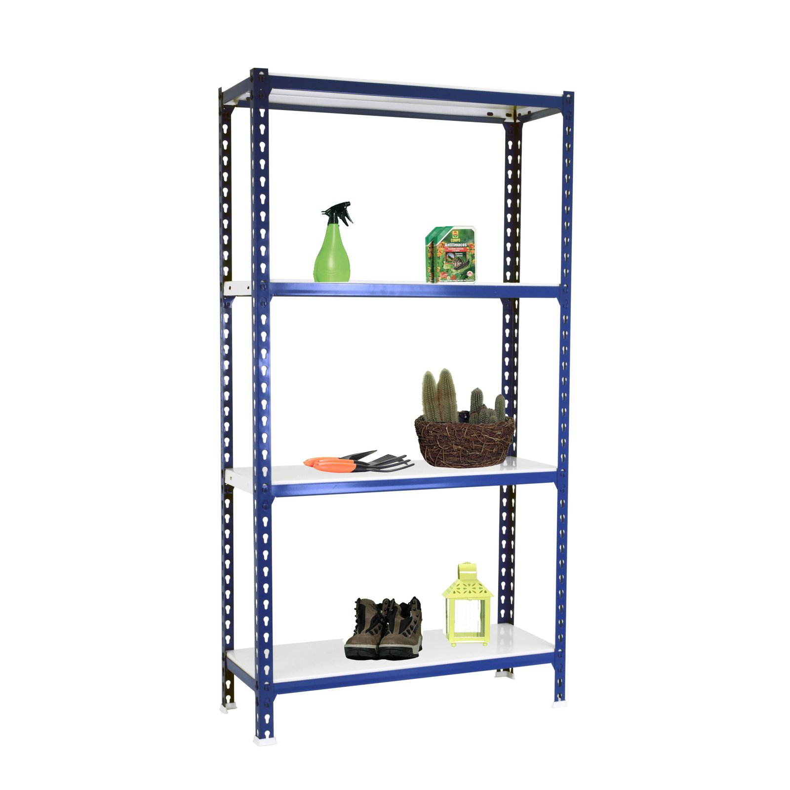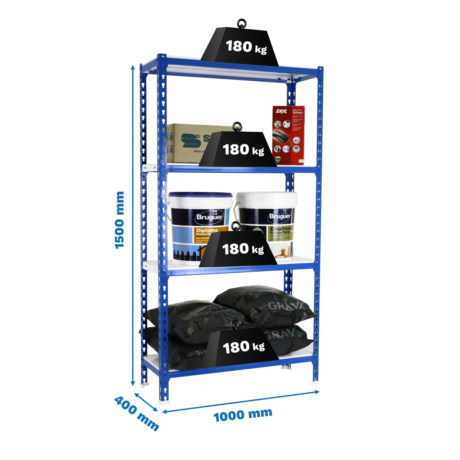 Estanteria metalica sin tornillos de color AZUL/BLANCO con capacidad de carga por estante de 180 kg. El numero de estantes es 4 y las medidas (alto x ancho x fondo) son 1500x1000x400 mm. La unica estanteria que permite poner las bandejas en tres posiciones diferentes. Producto europeo, calidad europea, podras encontrar las instrucciones de montaje en su interior o en este enlace, https, //www. youtube. com/watch?v=u3t2f21Mm7I. Medidas en uso del producto, 1485x1100x410 mm