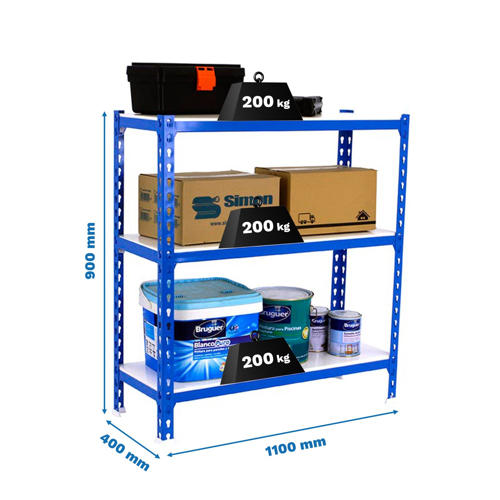 Estanteria metalica sin tornillos de color AZUL/BLANCO con capacidad de carga por estante de 200 kg. El numero de estantes es 3 y las medidas (alto x ancho x fondo) son 900x1100x400 mm. La unica estanteria que permite poner las bandejas en tres posiciones diferentes. Producto europeo, calidad europea, podras encontrar las instrucciones de montaje en su interior o en este enlace, https, //www. youtube. com/watch?v=u3t2f21Mm7I. Medidas en uso del producto, 877x1110x410 mm