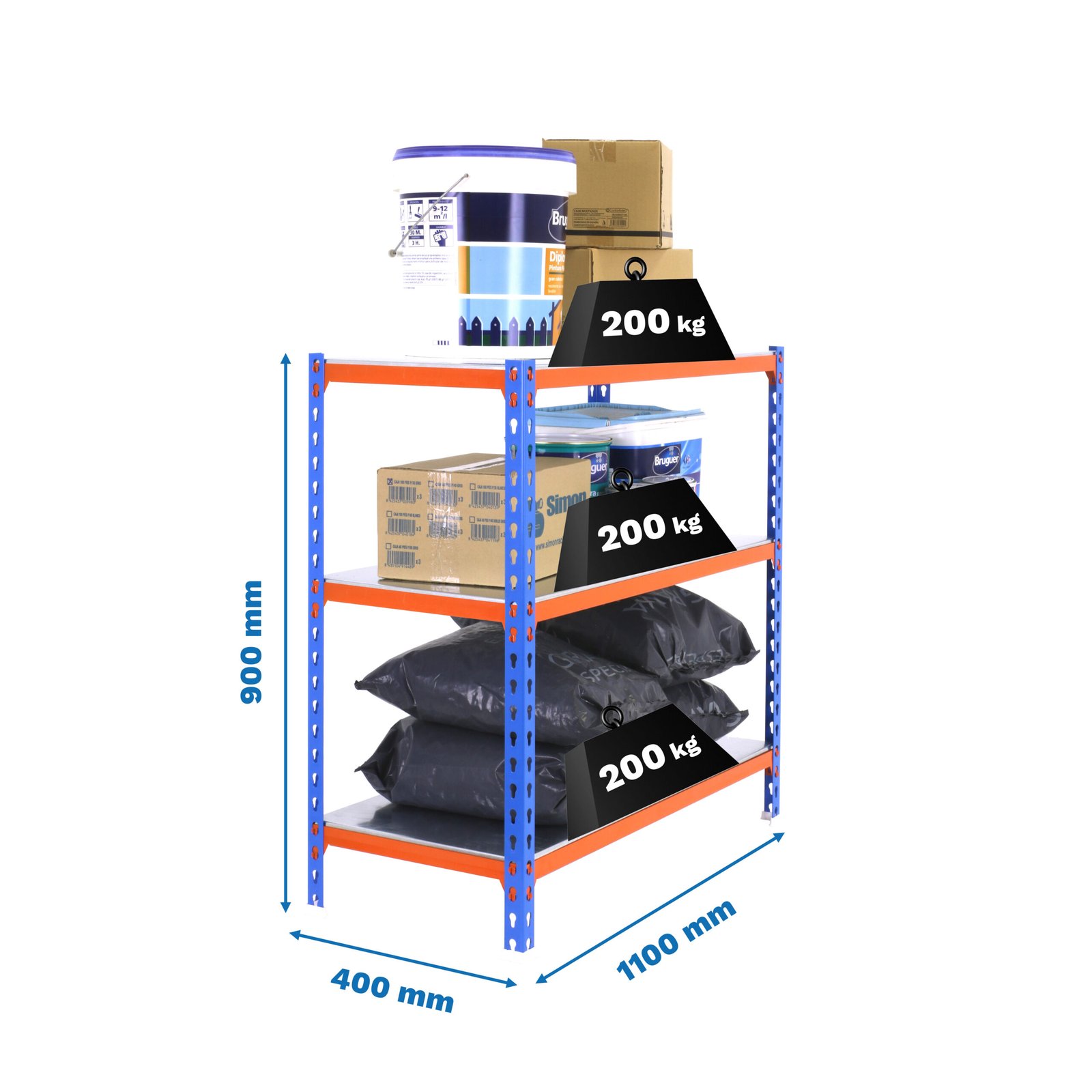 Estanteria metalica sin tornillos de color AZUL/NARANJA/GALVA con capacidad de carga por estante de 200 kg. El numero de estantes es 3 y las medidas (alto x ancho x fondo) son 900x1100x400 mm. La unica estanteria que permite poner las bandejas en tres posiciones diferentes. Producto europeo, calidad europea, podras encontrar las instrucciones de montaje en su interior o en este enlace, https, //www. youtube. com/watch?v=u3t2f21Mm7I. Medidas en uso del producto, 877x1110x410 mm