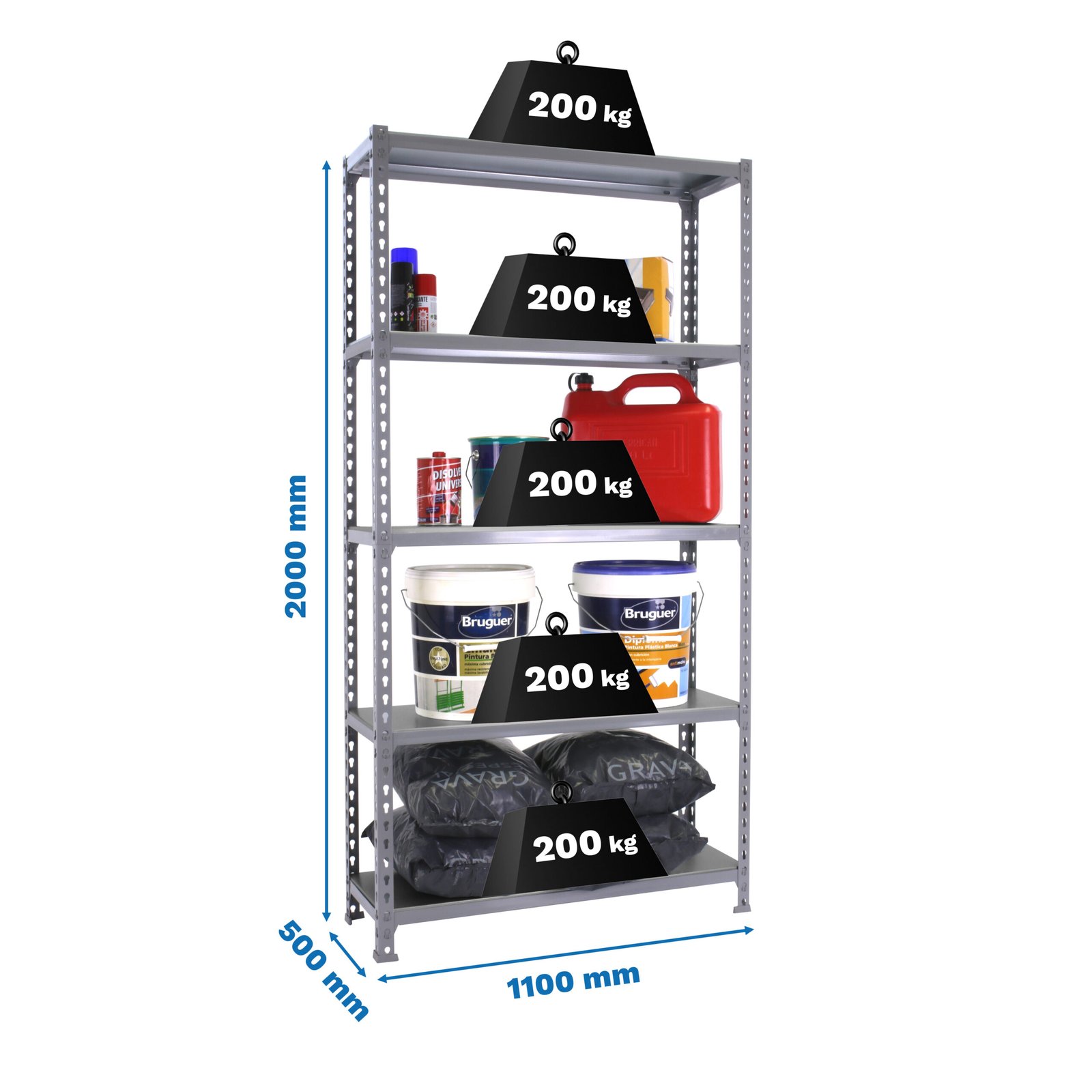 Estanteria metalica sin tornillos de color GRIS/GRIS con capacidad de carga por estante de 200 kg. El numero de estantes es 5 y las medidas (alto x ancho x fondo) son 2000x1100x500 mm. La unica estanteria que permite poner las bandejas en tres posiciones diferentes. Producto europeo, calidad europea, podras encontrar las instrucciones de montaje en su interior o en este enlace, https, //www. youtube. com/watch?v=u3t2f21Mm7I. Medidas en uso del producto, 1975x1110x510 mm