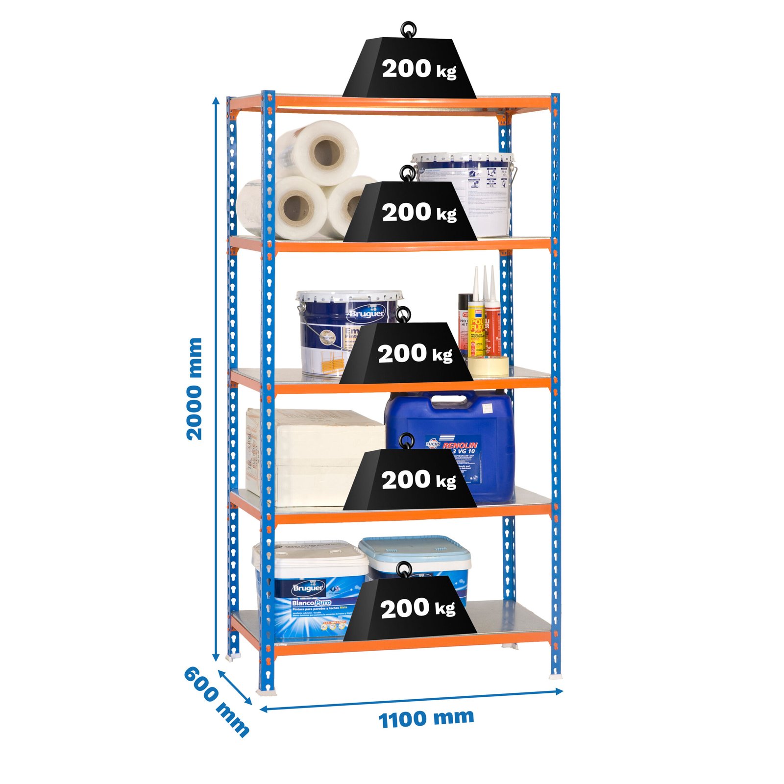 Estanteria metalica sin tornillos de color azul/naranja/galva con capacidad de carga por estante de 200 kg, carga certificada a punto de flexion, no de rotura. El numero de estantes es 5 y las medidas (alto x ancho x fondo) son 2000x1100x600 mm. La unica estanteria que permite poner las bandejas en tres posiciones diferentes, horizontal, inclinada o contenedora (al reves). Producto fabricado en Europa por Simonrack por Simonrack. Podras encontrar las instrucciones de montaje en su interior o en este enlace, https, //www. youtube. com/watch?v=u3t2f21Mm7I. Medidas en uso del producto, 1975x1110x610 mm. Contiene todos sus fondos. No contiene aristas de corte, manipulacion sin riesgo. No se tambalea. Estructura con recubrimiento epoxi poliester antirayaduras e ignifugo