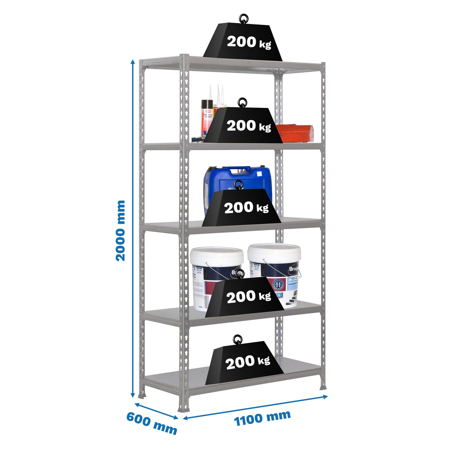 Estanteria metalica sin tornillos de color gris/galva con capacidad de carga por estante de 200 kg, carga certificada a punto de flexion, no de rotura. El numero de estantes es 5 y las medidas (alto x ancho x fondo) son 2000x1100x600 mm. La unica estanteria que permite poner las bandejas en tres posiciones diferentes, horizontal, inclinada o contenedora (al reves). Producto fabricado en Europa por Simonrack por Simonrack. Podras encontrar las instrucciones de montaje en su interior o en este enlace, https, //www. youtube. com/watch?v=u3t2f21Mm7I. Medidas en uso del producto, 1975x1110x610 mm. Contiene todos sus fondos. No contiene aristas de corte, manipulacion sin riesgo. No se tambalea. Estructura con recubrimiento epoxi poliester antirayaduras e ignifugo