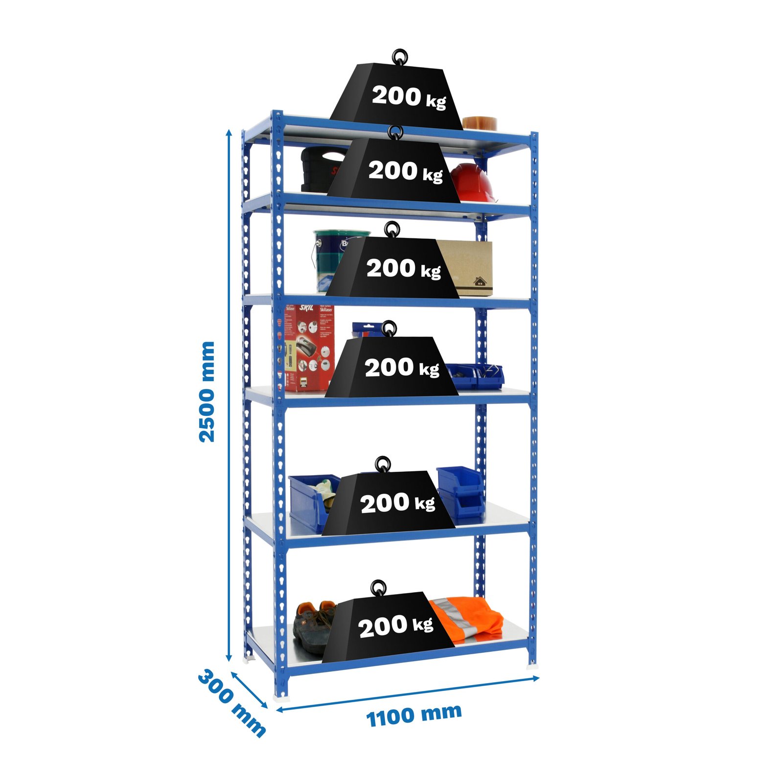Estanteria metalica sin tornillos de color AZUL/GALVA con capacidad de carga por estante de 200 kg. El numero de estantes es 6 y las medidas (alto x ancho x fondo) son 2500x1100x300 mm. La unica estanteria que permite poner las bandejas en tres posiciones diferentes. Producto europeo, calidad europea, podras encontrar las instrucciones de montaje en su interior o en este enlace, https, //www. youtube. com/watch?v=u3t2f21Mm7I. Medidas en uso del producto, 2510x1110x310 mm