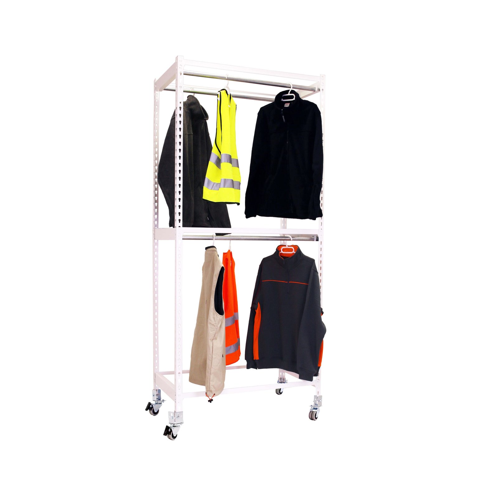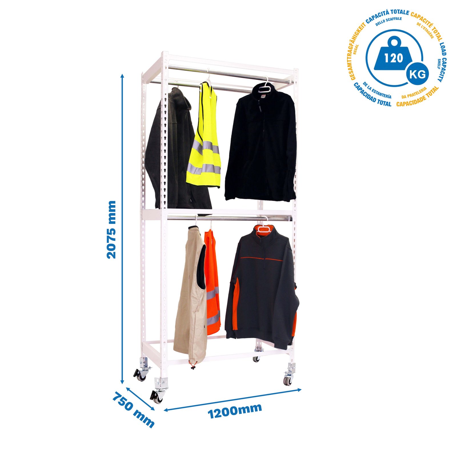 Estanteria metalica para prenda colgada de color blanco. Con ruedas. El numero de colgadores por modulo es de 2. Tiene una capacidad de carga por estante de 25 kg y una capacidad total de 50 kgs. Con unas medidas en mm de 2000x1200x750. Fabricada en Europa por Simonrack y se monta rapido siguiendo las instrucciones