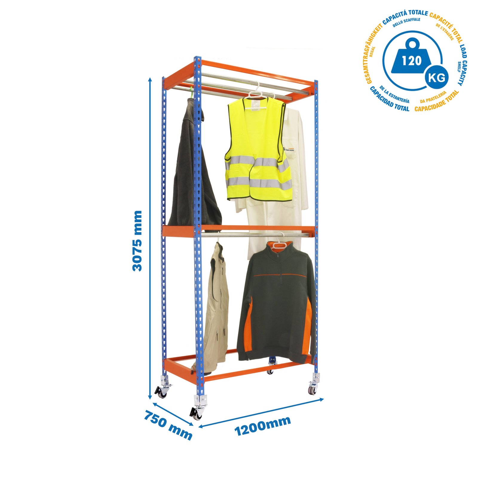 Estanteria sin tornillos para prenda colgada, de color AZUL/NARANJA. Las dimensiones de esta estanteria son, 3000x1200x750 mm. Y tiene una capacidad de carga de 25 kgs. Incluye ruedas. No se tambalea y no tiene aristas de corte. Es fabricado en Europa por Simonrack y se monta rapido siguiendo las instrucciones. El numero de colgadores por modulo es, 3