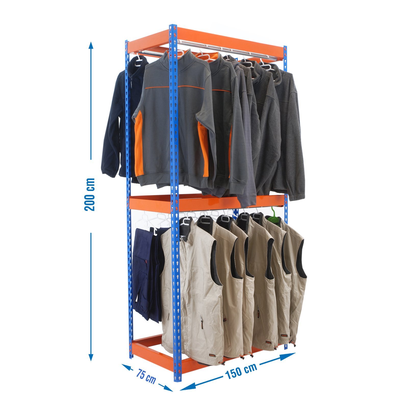 Estanteria para prenda colgada, de color AZUL/NARANJA. Las dimensiones de esta estanteria son, 2000x1500x750 mm. Y tiene una capacidad de carga de 30 kgs. Es fabricado en Europa por Simonrack y se monta rapido siguiendo las instrucciones. El numero de colgadores por modulo es, 2