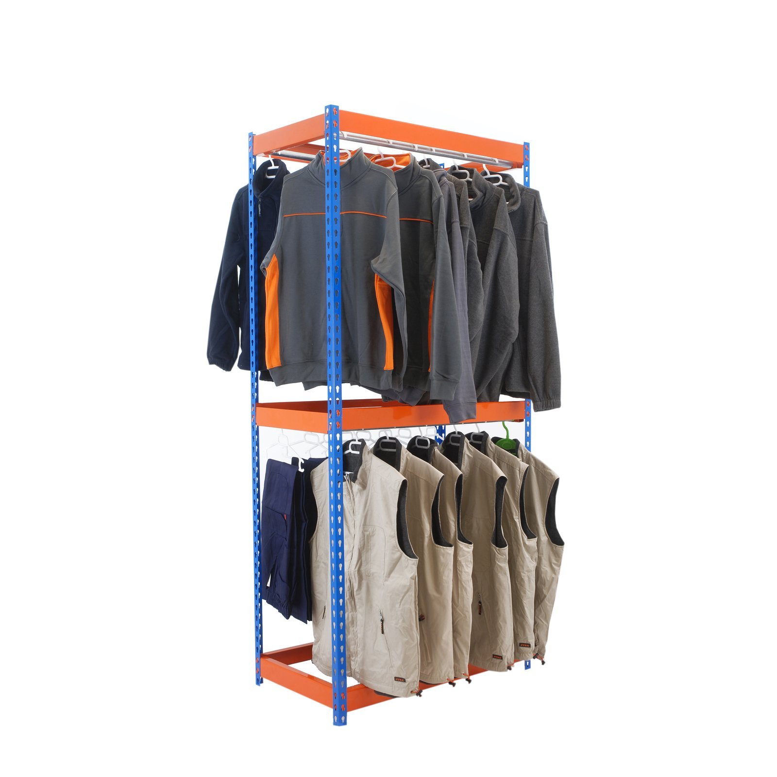 Estanteria para prenda colgada, de color AZUL/NARANJA. Las dimensiones de esta estanteria son, 2500x1500x750 mm. Y tiene una capacidad de carga de 30 kgs. Es fabricado en Europa por Simonrack y se monta rapido siguiendo las instrucciones. El numero de colgadores por modulo es, 2