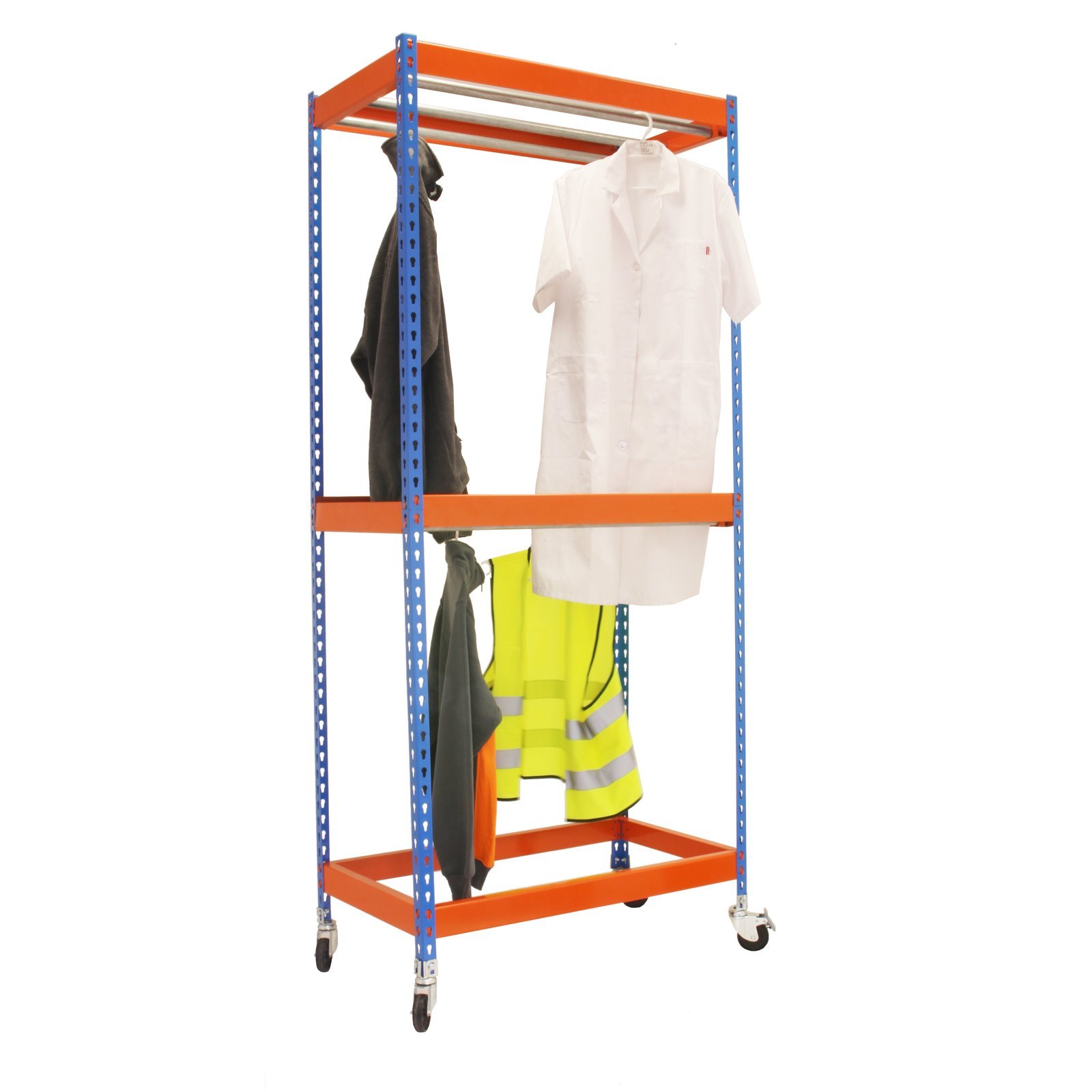 Estanteria para prenda colgada, de color AZUL/NARANJA. Las dimensiones de esta estanteria son, 3000x1500x750 mm. Y tiene una capacidad de carga de 30 kgs. Incluye ruedas. Es fabricado en Europa por Simonrack y se monta rapido siguiendo las instrucciones. El numero de colgadores por modulo es, 3