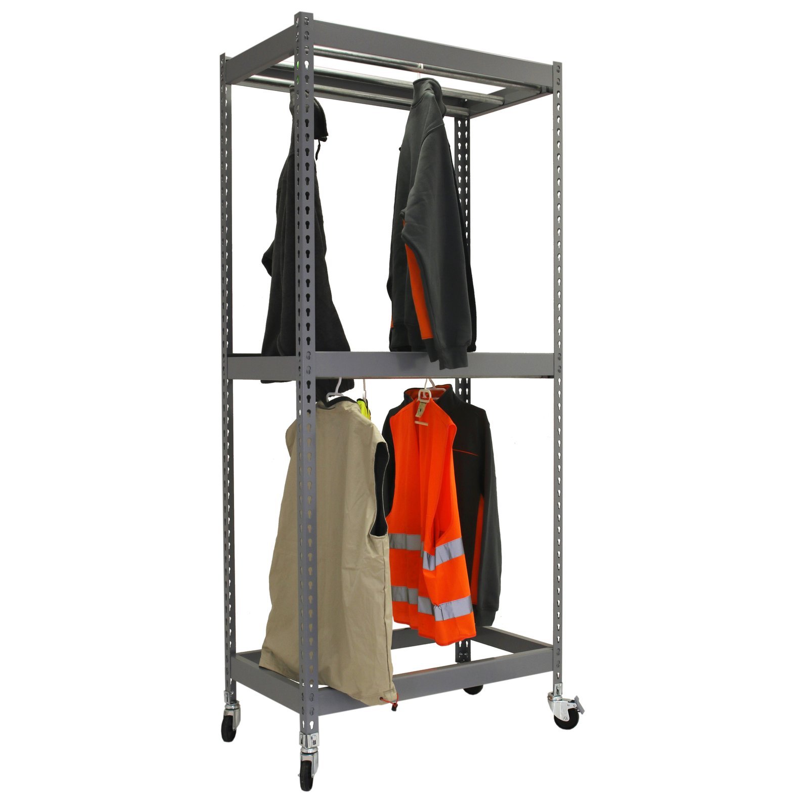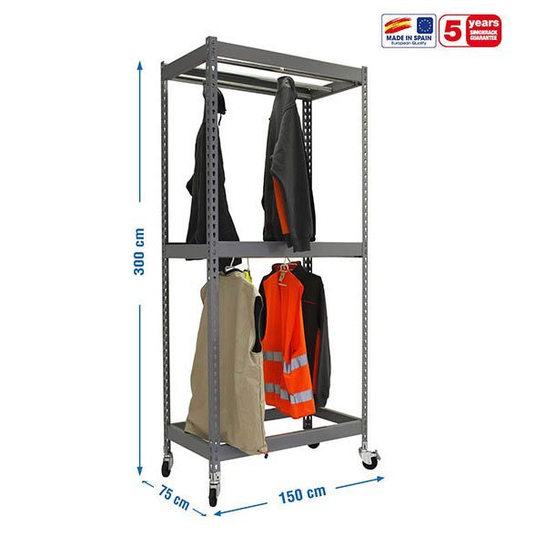 Estanteria metalica para prenda colgada de color gris. Con ruedas. El numero de colgadores por modulo es de 3. Tiene una capacidad de carga por estante de 30 kg y una capacidad total de 90 kgs. Con unas medidas en mm de 3000x1500x750. Fabricada en Europa por Simonrack y se monta rapido siguiendo las instrucciones