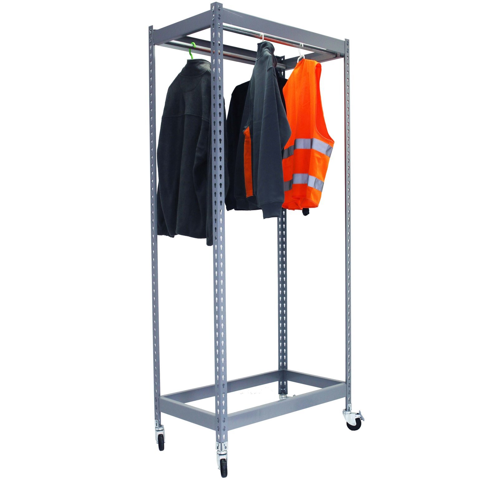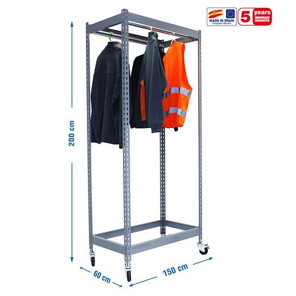 Estanteria metalica para prenda colgada de color gris. Con ruedas. El numero de colgadores por modulo es de 2. Tiene una capacidad de carga por estante de 30 kg y una capacidad total de 60 kgs. Con unas medidas en mm de 2000x1500x600. Fabricada en Europa por Simonrack y se monta rapido siguiendo las instrucciones