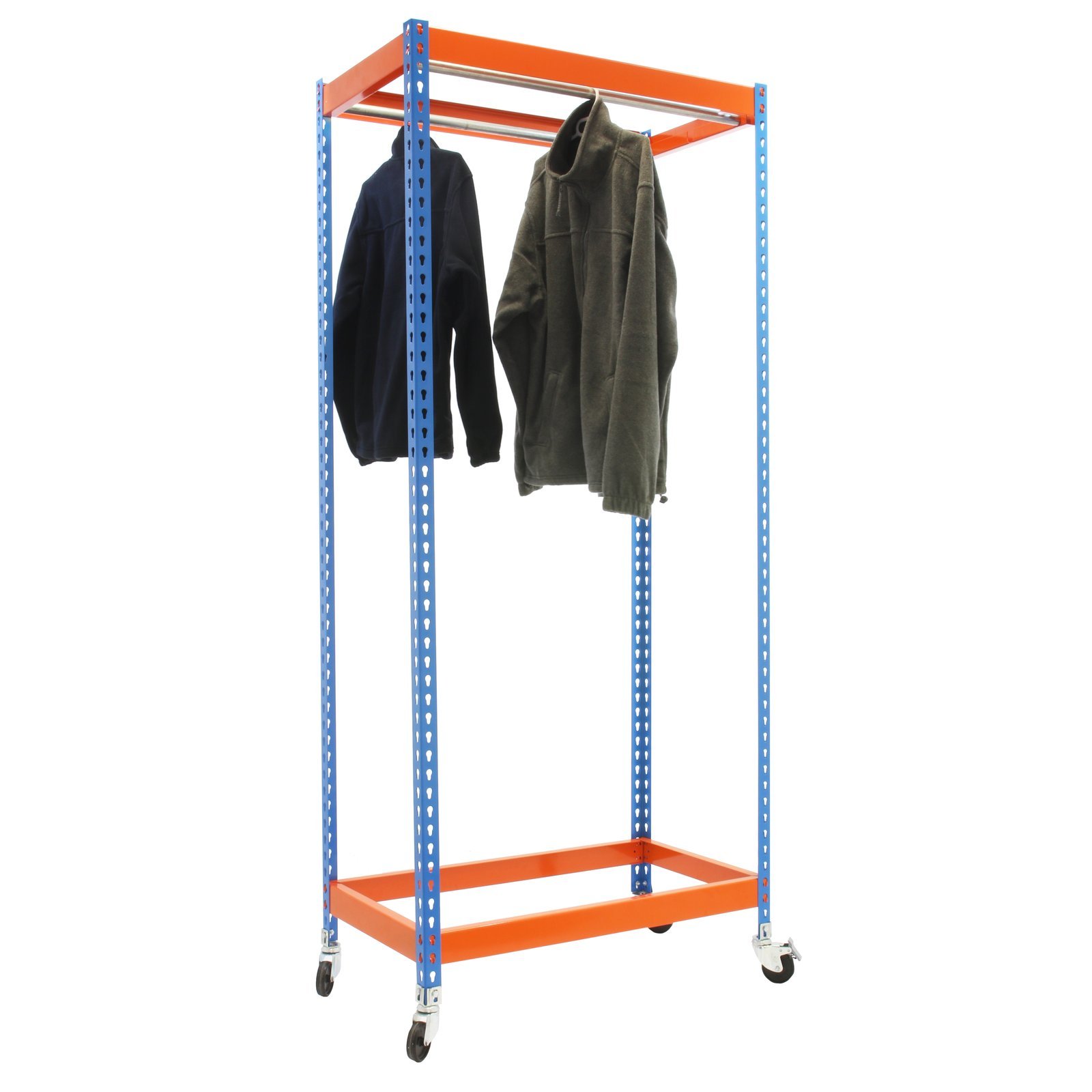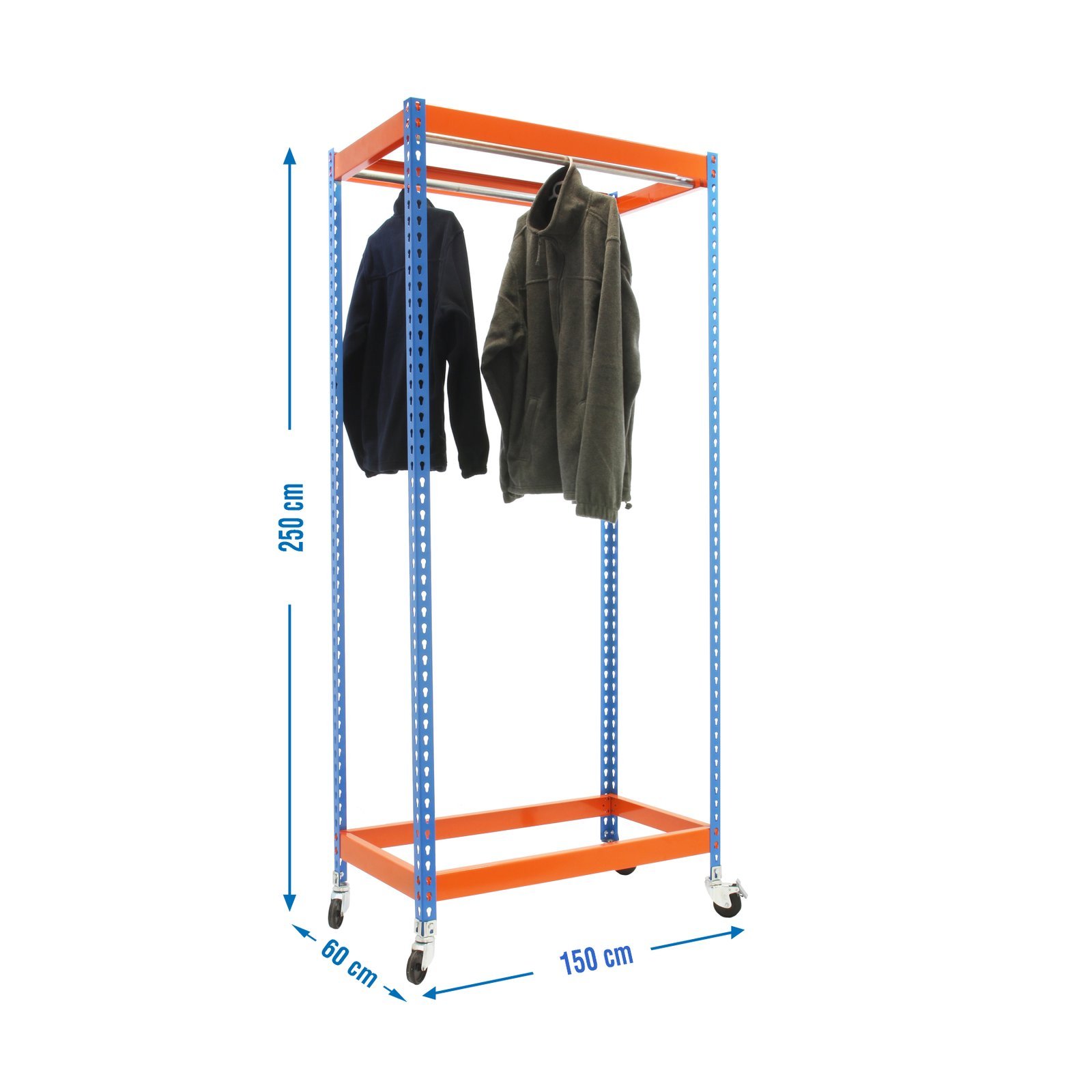 Estanteria para prenda colgada, de color AZUL/NARANJA. Las dimensiones de esta estanteria son, 2500x1500x600 mm. Y tiene una capacidad de carga de 30 kgs. Incluye ruedas. Es fabricado en Europa por Simonrack y se monta rapido siguiendo las instrucciones. El numero de colgadores por modulo es, 2
