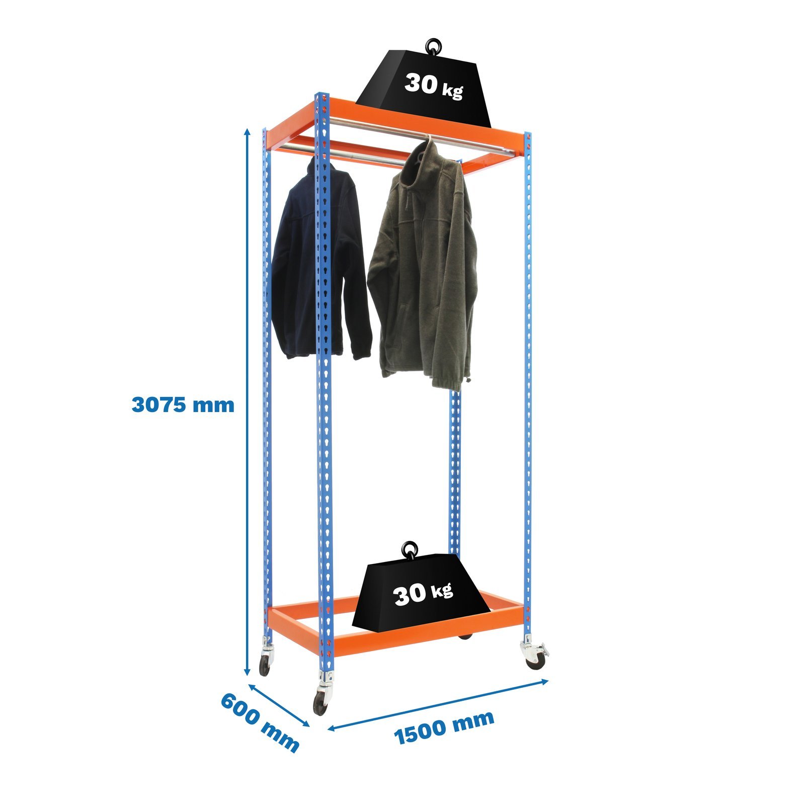 Estanteria para prenda colgada, de color AZUL/NARANJA. Las dimensiones de esta estanteria son, 3000x1500x600 mm. Y tiene una capacidad de carga de 30 kgs. Incluye ruedas. Es fabricado en Europa por Simonrack y se monta rapido siguiendo las instrucciones. El numero de colgadores por modulo es, 3