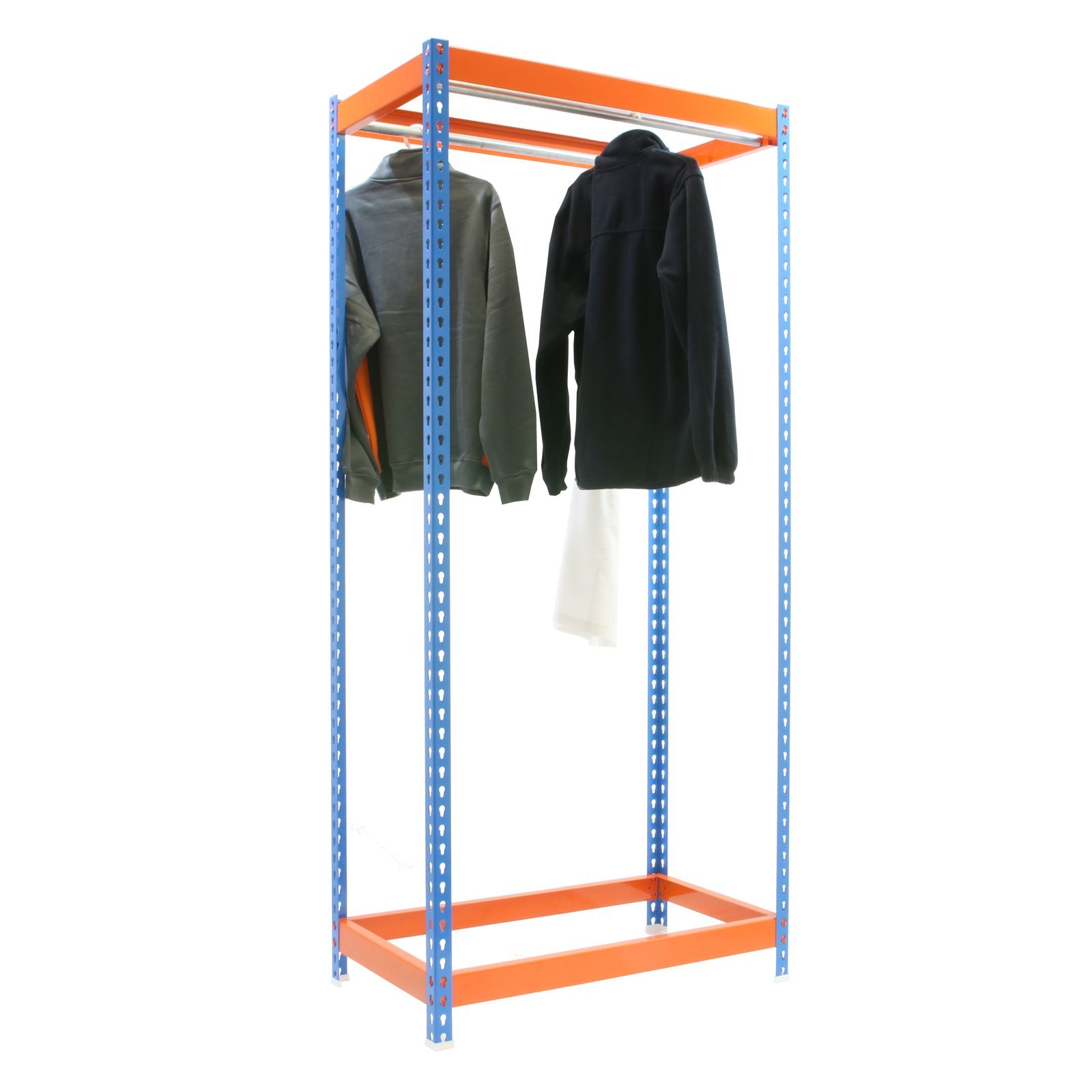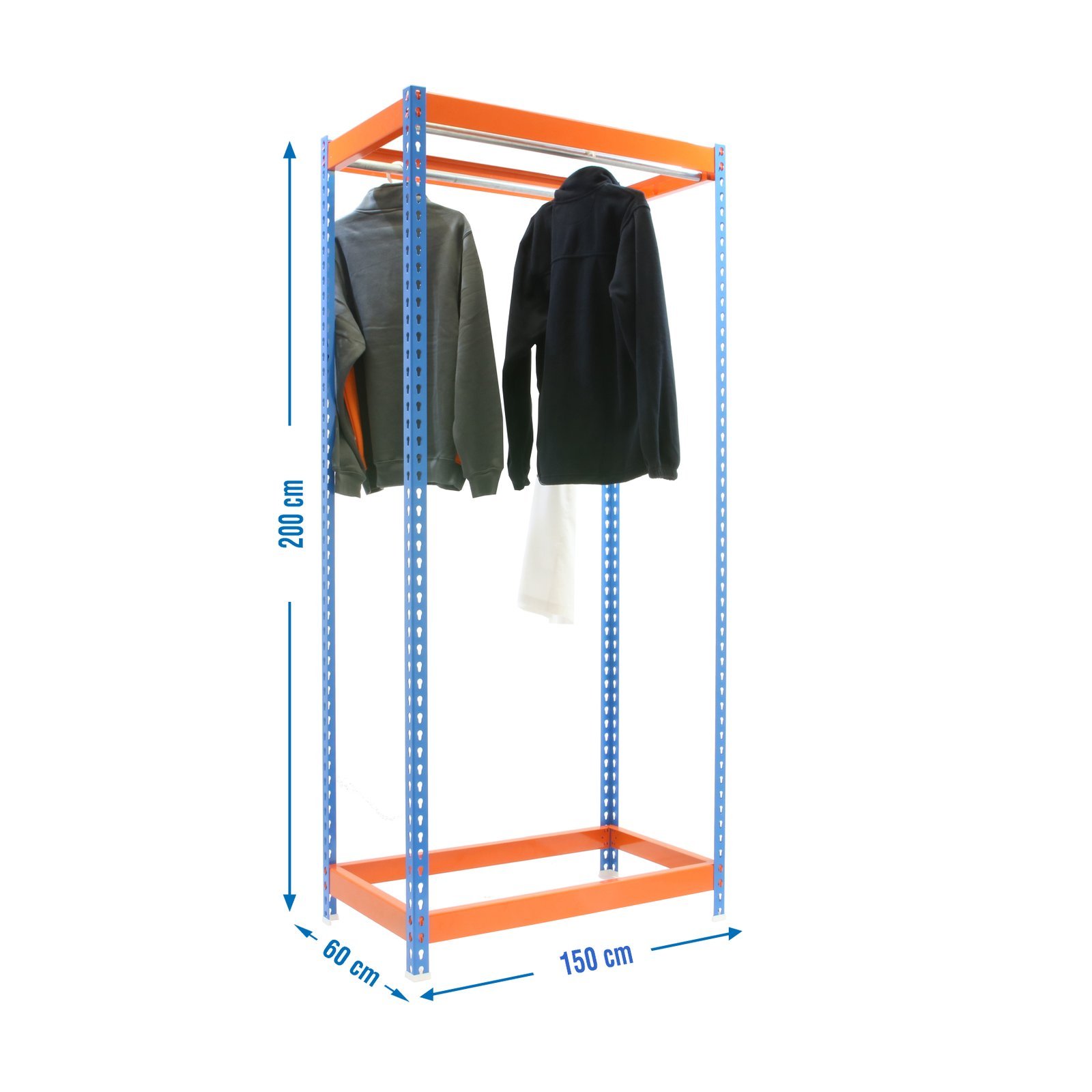 Estanteria sin tornillos para prenda colgada, de color AZUL/NARANJA. Las dimensiones de esta estanteria son, 2000x1500x600 mm. Y tiene una capacidad de carga de 30 kgs. Es fabricado en Europa por Simonrack y se monta rapido siguiendo las instrucciones. El numero de colgadores por modulo es, 2