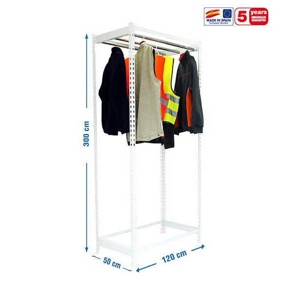 Estanteria metalica para prenda colgada de color blanco. El numero de colgadores por modulo es de 3. Tiene una capacidad de carga por estante de 25 kg y una capacidad total de 75 kgs. Con unas medidas en mm de 3000x1200x500. Fabricada en Europa por Simonrack y se monta rapido siguiendo las instrucciones