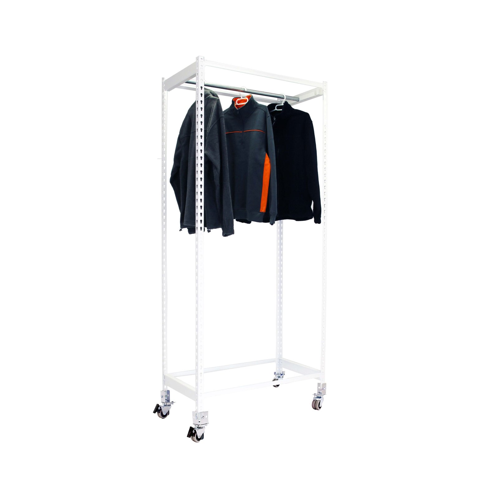 Estanteria metalica para prenda colgada de color blanco. Con ruedas. El numero de colgadores por modulo es de 1. Tiene una capacidad de carga por estante de 25 kg y una capacidad total de 25 kgs. Con unas medidas en mm de 1500x900x500. Fabricada en Europa por Simonrack y se monta rapido siguiendo las instrucciones