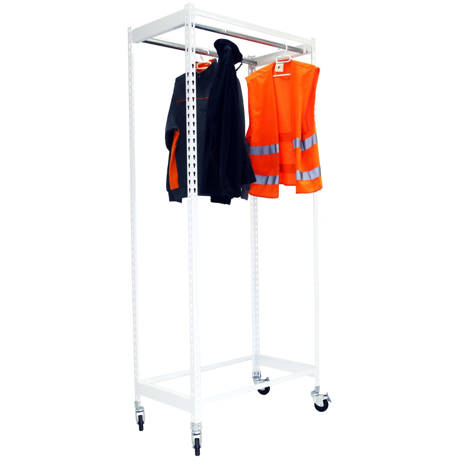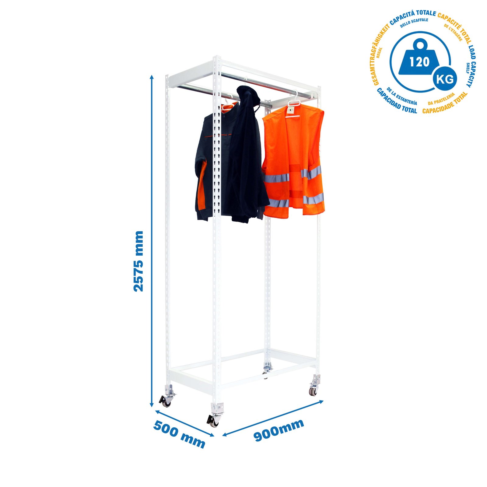 Estanteria metalica para prenda colgada de color blanco. Con ruedas. El numero de colgadores por modulo es de 2. Tiene una capacidad de carga por estante de 25 kg y una capacidad total de 50 kgs. Con unas medidas en mm de 2500x900x500. Fabricada en Europa por Simonrack y se monta rapido siguiendo las instrucciones