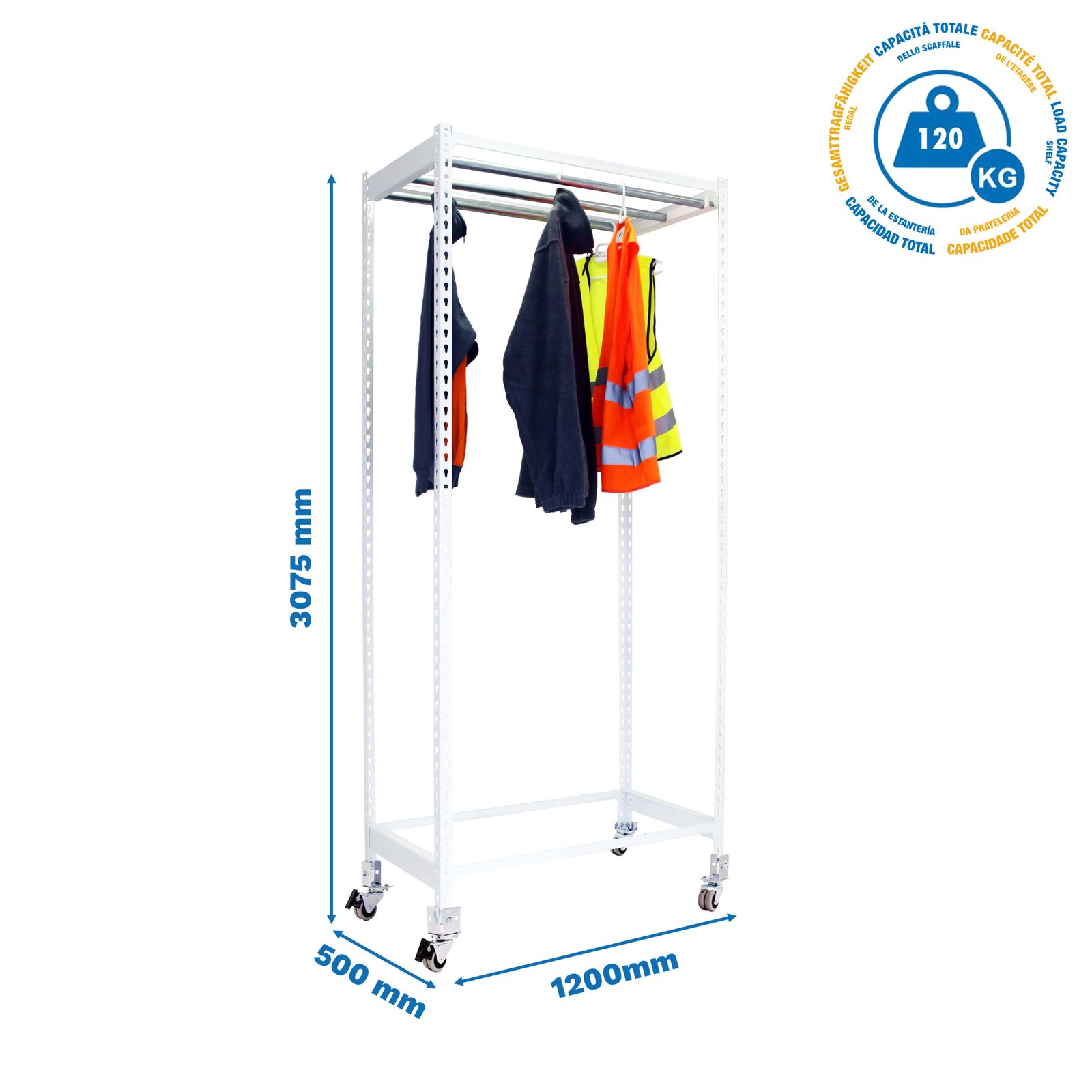 Estanteria metalica para prenda colgada de color blanco. Con ruedas. El numero de colgadores por modulo es de 3. Tiene una capacidad de carga por estante de 25 kg y una capacidad total de 75 kgs. Con unas medidas en mm de 3000x1200x500. Fabricada en Europa por Simonrack y se monta rapido siguiendo las instrucciones