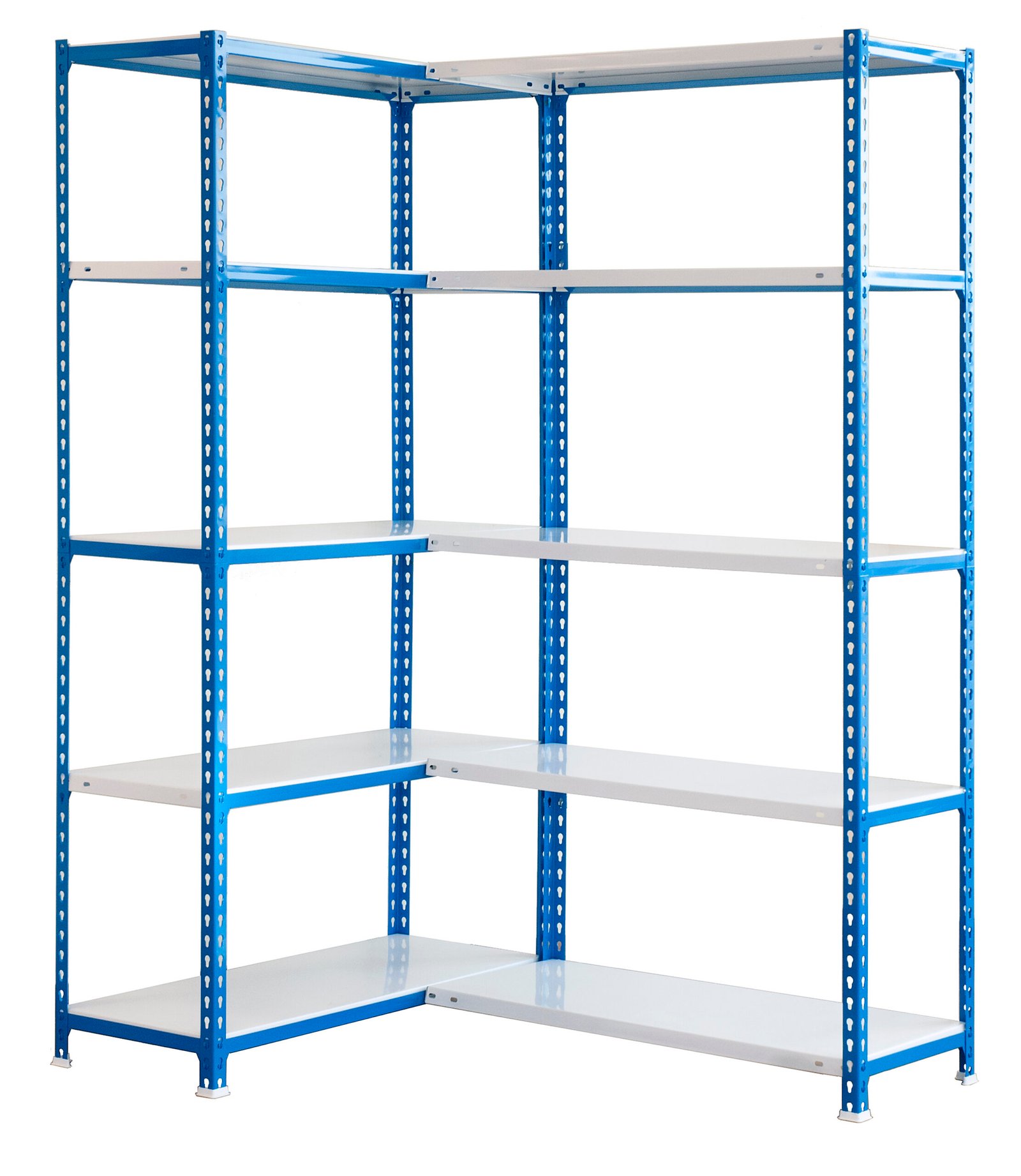 Estanteria metalica sin tornillos en forma de L, de color AZUL/BLANCO. Tiene 10 estantes. Las dimensiones de esta estanteria son, 1800x1000x400 mm. Y tiene una capacidad de carga de 80 kgs, certificamos a punto de flexion, no de rotura. Se puede montar indistintamente con el lado corto y largo de la base intercambiados. No se tambalea y no tiene aristas de corte. Es fabricado en Europa por Simonrack y se monta rapido siguiendo las instrucciones