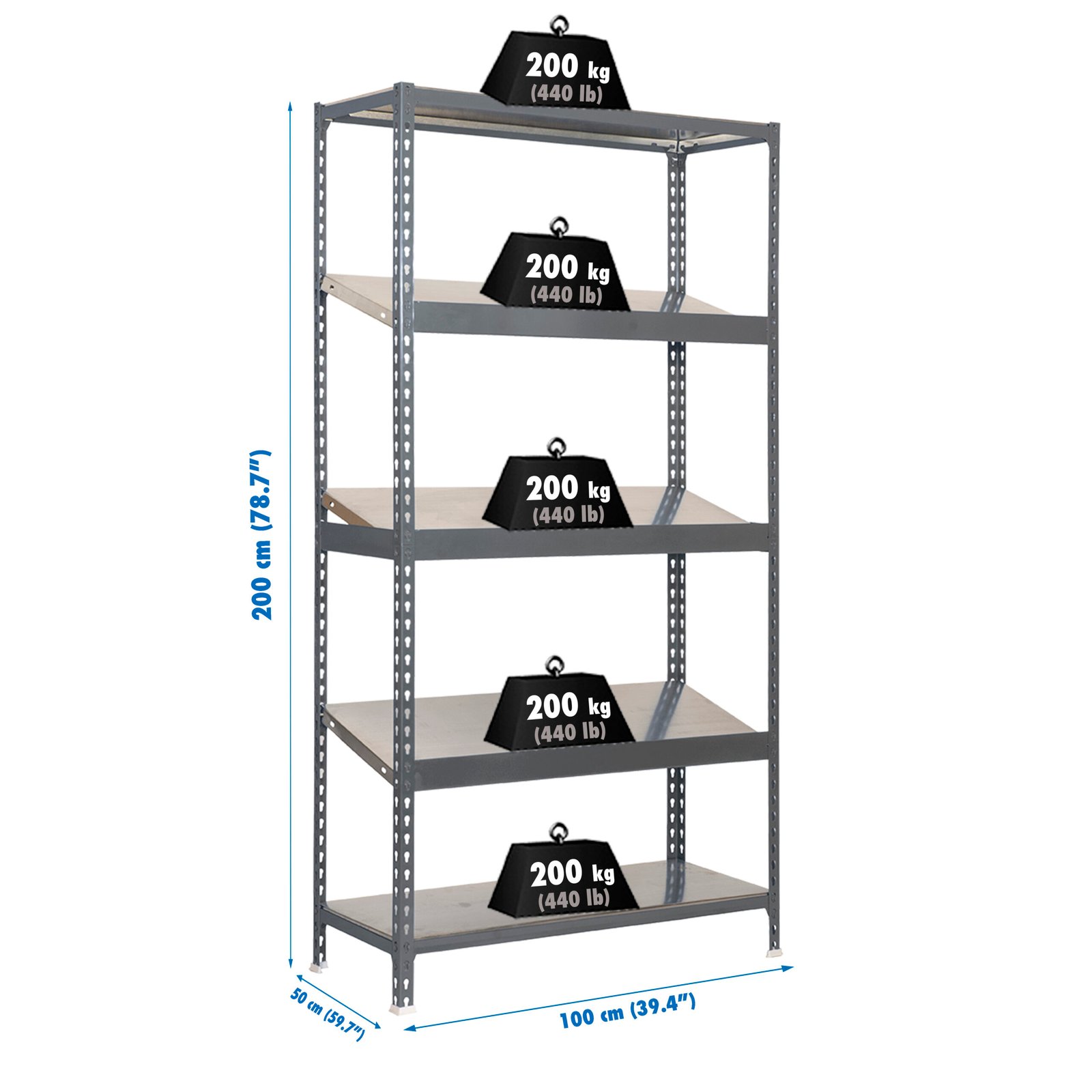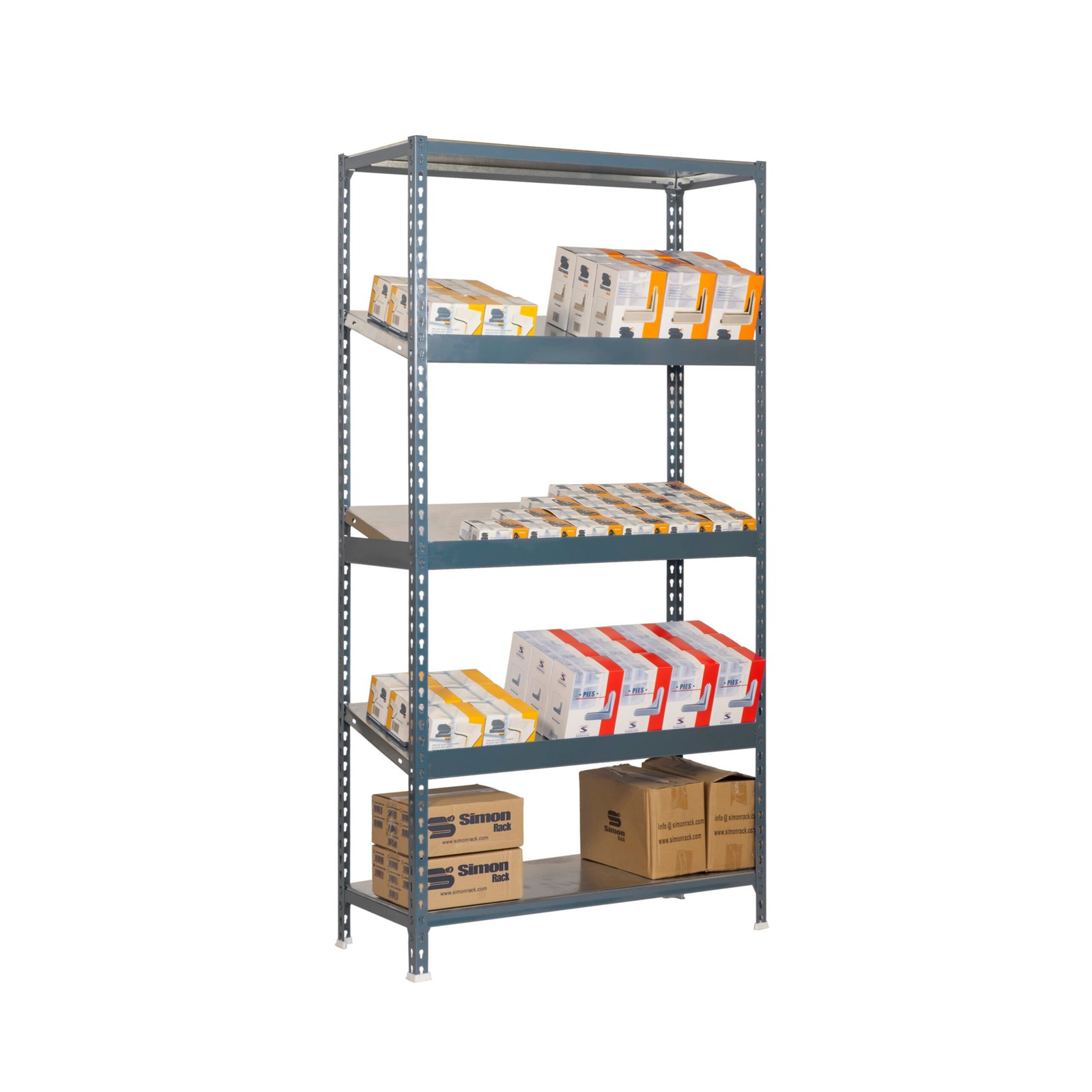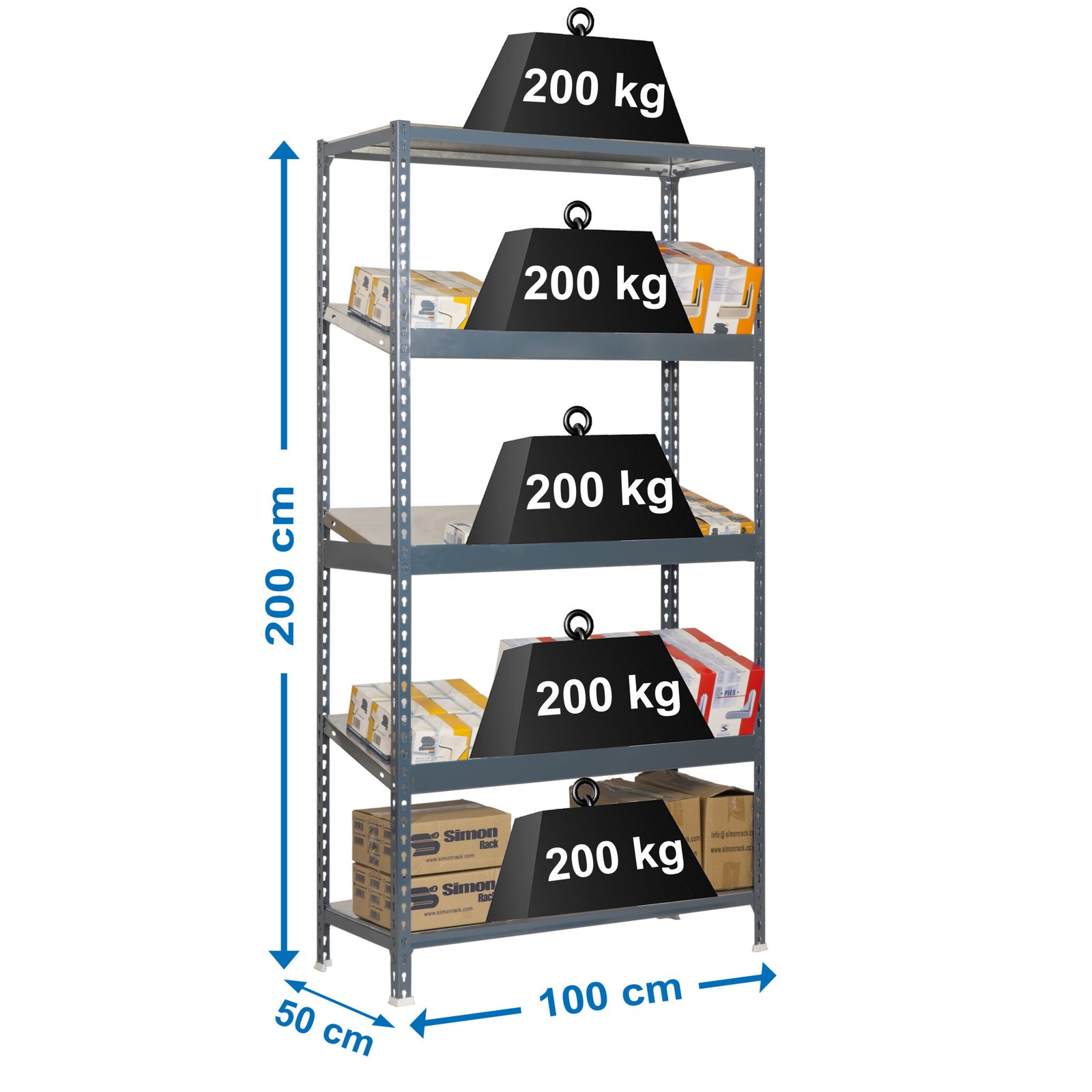 Estanteria metalica para exposicion de producto de color GRIS. Tiene 5 estantes. Las dimensiones de esta estanteria son, 2000x1000x500 mm. Y tiene una capacidad de carga de 200 kgs. No se tambalea y no tiene aristas de corte. Ideal para exposicion de productos. Es fabricado en Europa por Simonrack y se monta rapido siguiendo las instrucciones