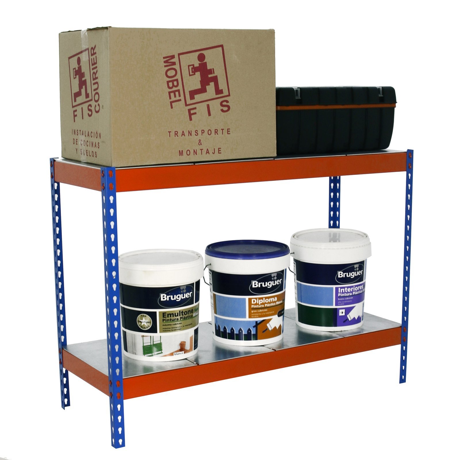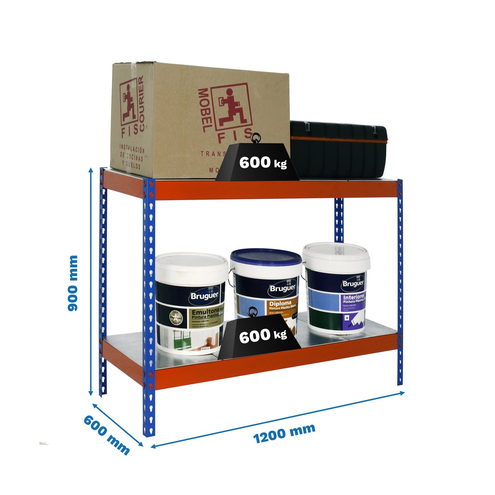 Estanteria media carga sin tornillos de color azul/naranja/galva con 2 estantes metalicos. Tiene una capacidad de carga por estante de 600 kg y una capacidad total de 1200 kgs. Incluye bandejas de metal. Con unas medidas en mm de 900x1200x600. Fabricada en Europa por Simonrack y se monta rapido siguiendo las instrucciones