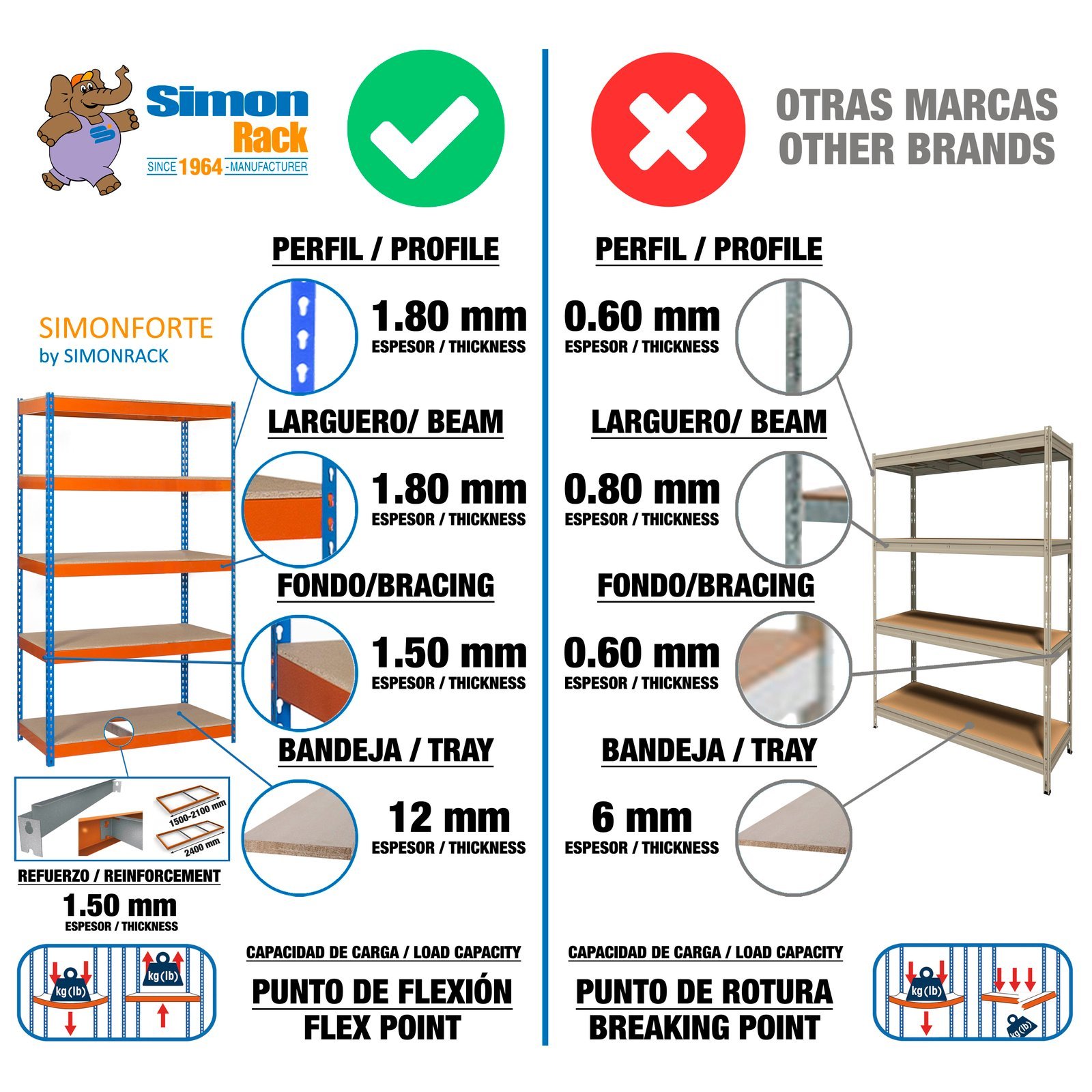 Estanteria media carga sin tornillos de color azul/naranja/madera con 3 alturas. Tiene una capacidad de carga por estante de 600 kg y una capacidad total de 1800 kgs, certificamos a punto de flexion, no de rotura. Incluye 3 aglomerados. Con unas medidas en mm de 1500x1200x600. Fabricada en Europa por Simonrack y se monta rapido siguiendo las instrucciones